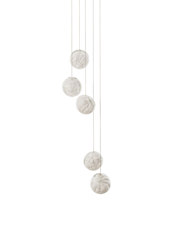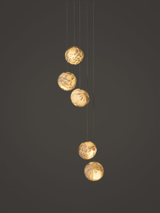 118.5 is comprised of 5 hand-blown glass pendants which attach to a single canopy.