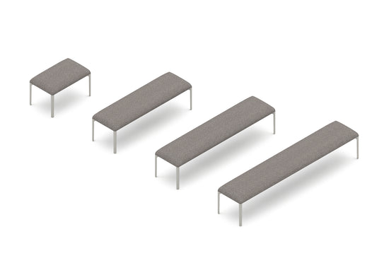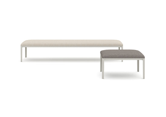 The immense strength of the cast aluminum legs produces lengthy bench proportions, that augment the airy effect of the chamfered border edges. Available in a curated selected of exterior rated fabrics to complement or contrast the sand gray finish of the bench legs.