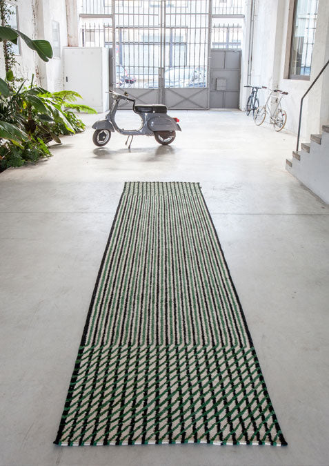Their mastery, meticulousness, and tireless ability to always go a step further, has led them to work on Blur, a collection that offers two different readings. When viewing the rug from afar, an indefinite, unfocused surface is apparent, that gives its name to the collection. Nevertheless, upon approaching the rug, lines and rhythmic rhombuses in different proportions are revealed, in the purest kinetic style.