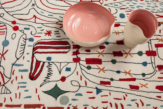 A first glance reveals a chaotic tangle of colours and shapes that invade the rug. However, after looking carefully, the imagination of Jaime Hayon springs to life: turtles, lips, hands, stools, fish, half men – half birds…