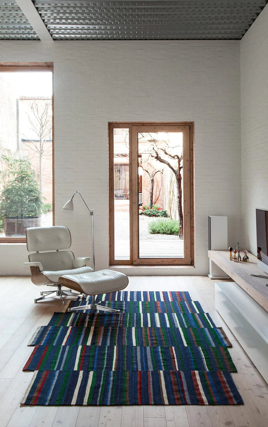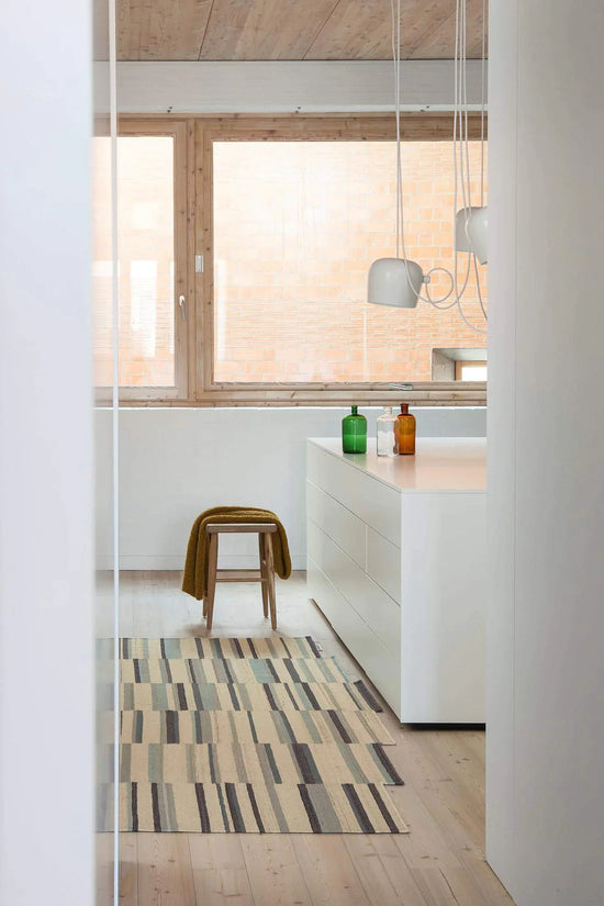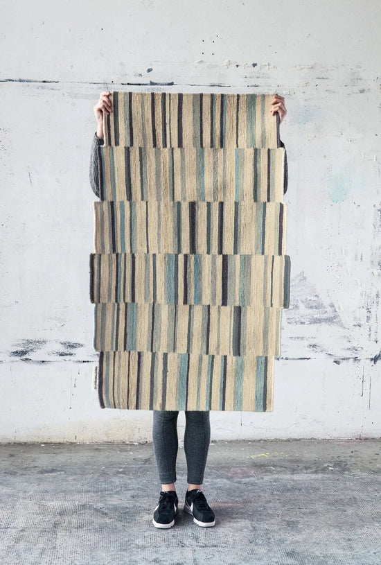 The Lattice collection is handcrafted using the ancestral, hand-loomed kilim technique and comes in four sizes, including a small, bedside version, and two colours; this one in shades of cream, greys and blues.