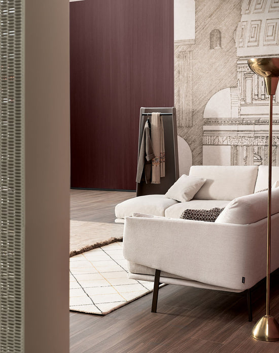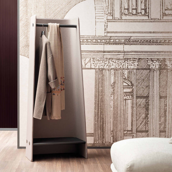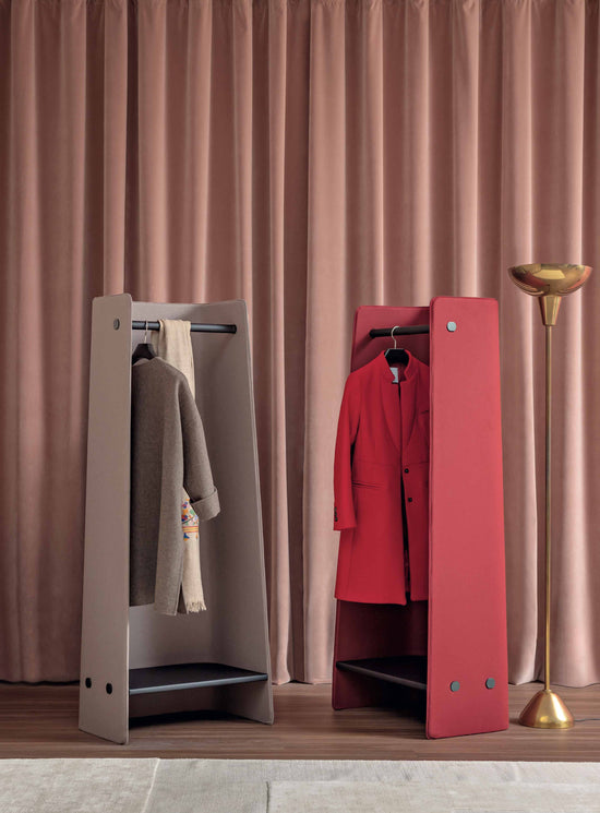 Parentesi stands out for its simple yet uncommon style suited to different settings, from the entrance hall, to the bedroom, from the office to the most refined contract spaces. The frame is padded and upholstered in fabric; the top and tubular hanger rail are in black eco-leather. The wide range of choice of the fabric allows Parentesi to assume a more classic or bold look, while keeping its functionality and timeless elegance unaltered.
