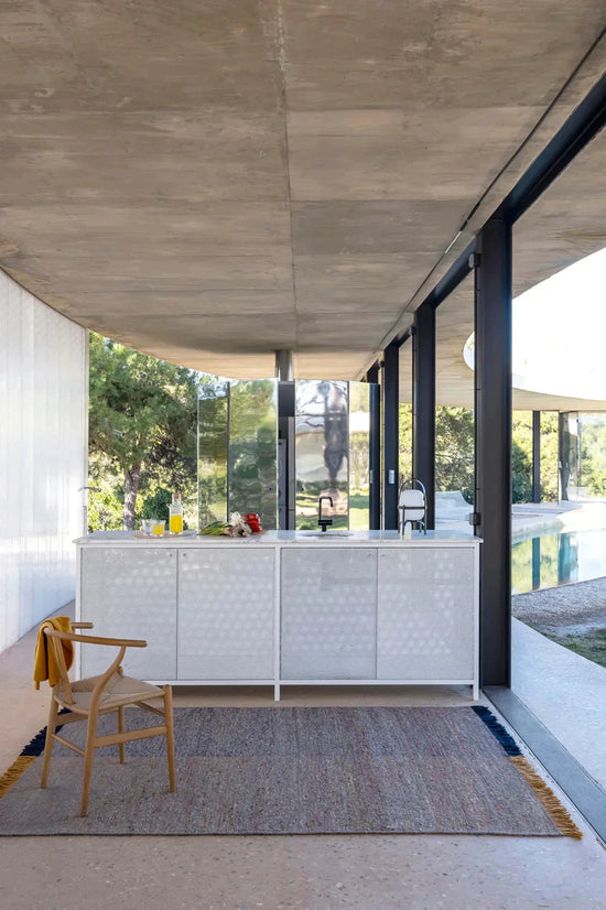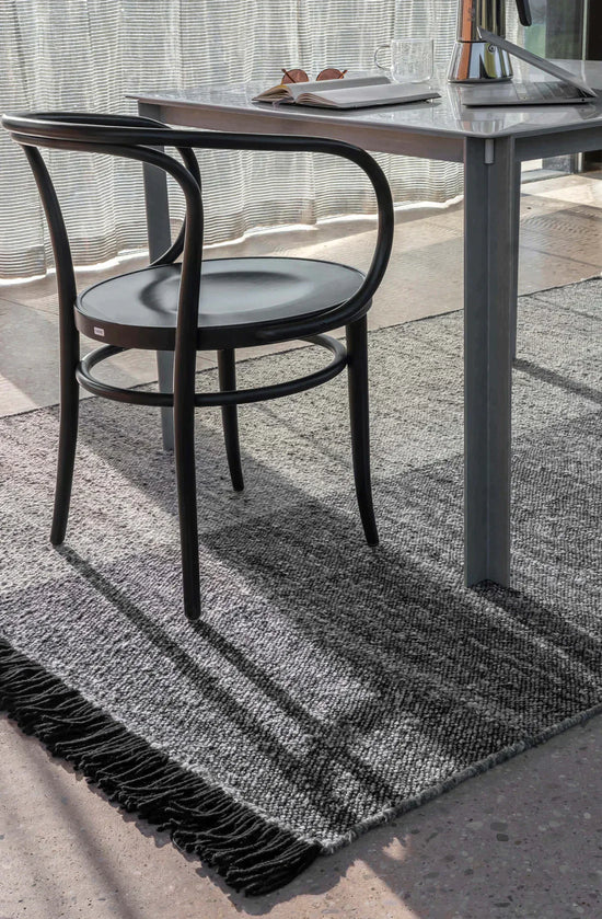 The Re-Rug collection is made using the hand-loomed dhurrie technique, resulting in rugs with a flat structure formed from the cross between the warp and weft. In the case of Re-Rug, in order to obtain greater strength and quality, the structural part of the rug, i.e. the warp, is made of New Zealand virgin wool dyed black and white, yellow or blue, green or tile. And in the weft, the marbled recycled yarn of varying thickness and colour.