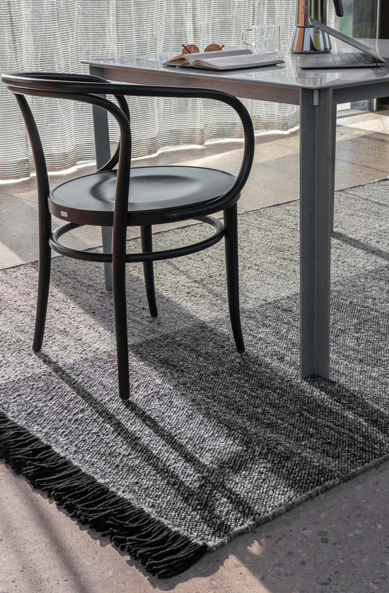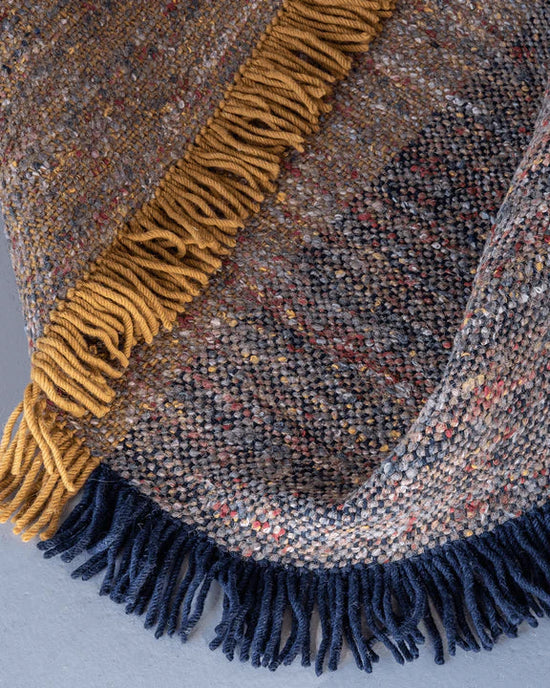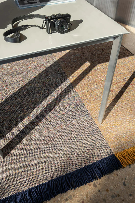 The Re-Rug collection is made using the hand-loomed dhurrie technique, resulting in rugs with a flat structure formed from the cross between the warp and weft. In the case of Re-Rug, in order to obtain greater strength and quality, the structural part of the rug, i.e. the warp, is made of New Zealand virgin wool dyed black and white, yellow or blue, green or tile. And in the weft, the marbled recycled yarn of varying thickness and colour.