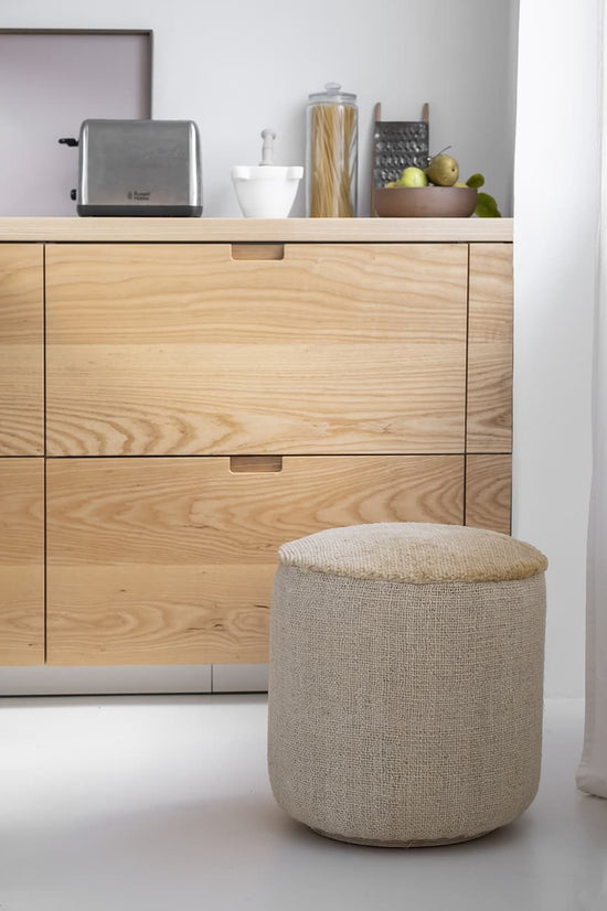 The sides of the Tres Persian Pouf Black are made with nanimarquina’s Tres black rug and the seat is made with Persian Colors re-edited in matt black. The sides of the Tres Persian Pouf Vegetal are made with the Tres Vegetal rug and the seat with the Persian Colors re-edited in natural matt color.