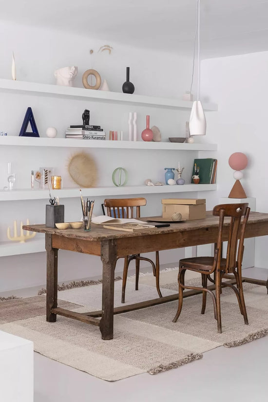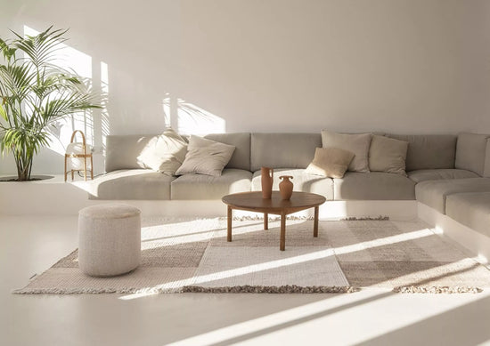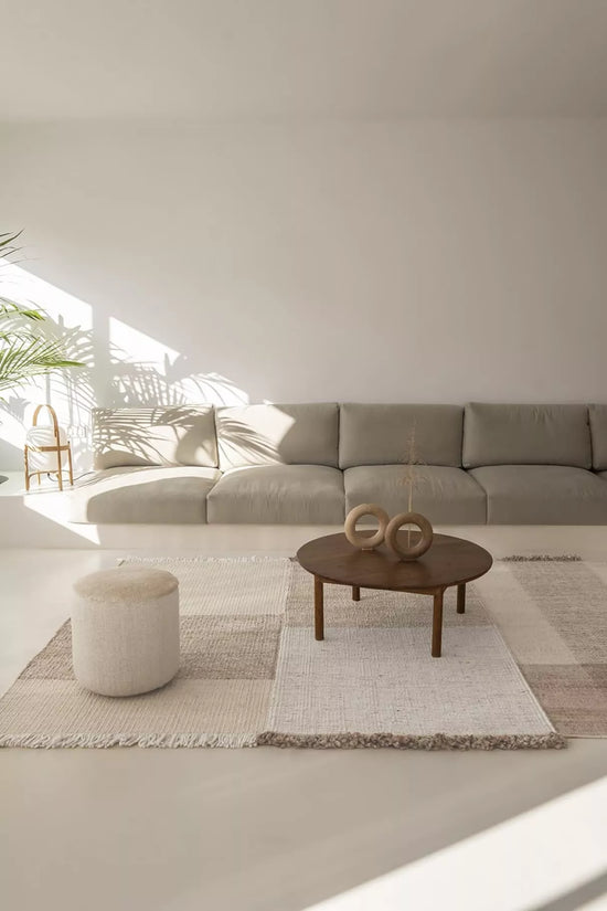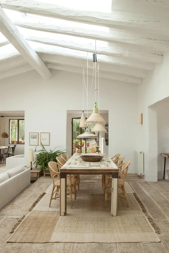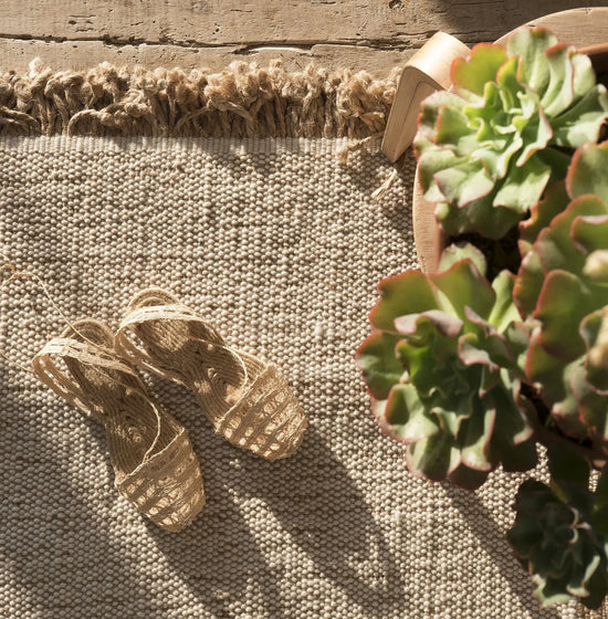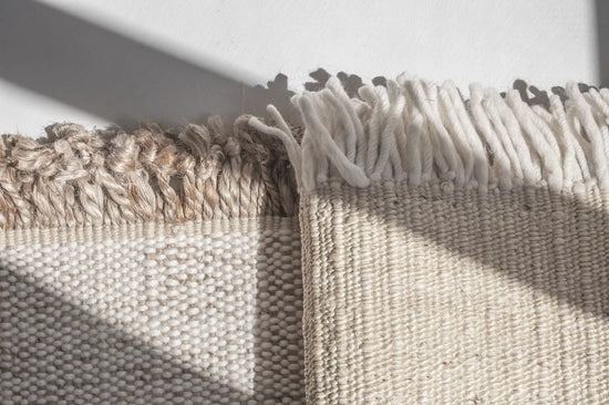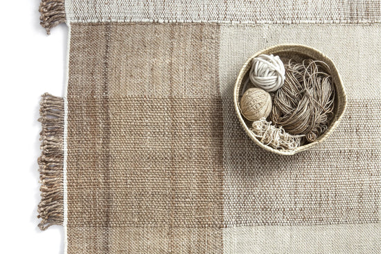The beauty of this collection, a flat weave created in India, lies in the irregularities generated by the crossing of the fibres and their different thicknesses, but also in the shades of beige, ivory or off-white fibres.