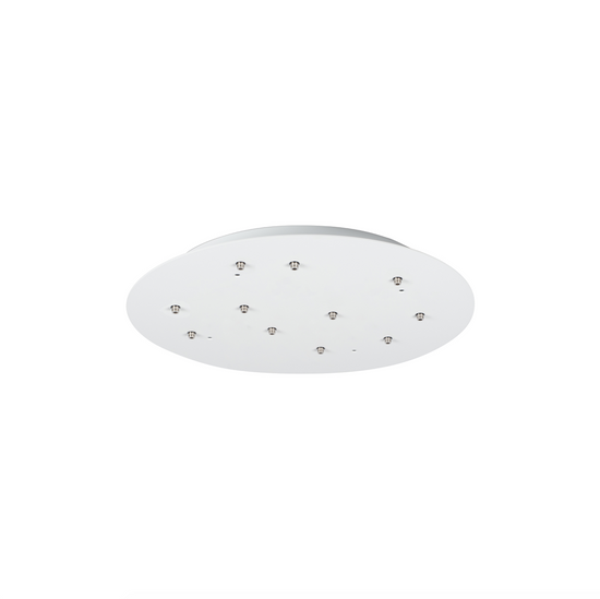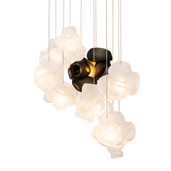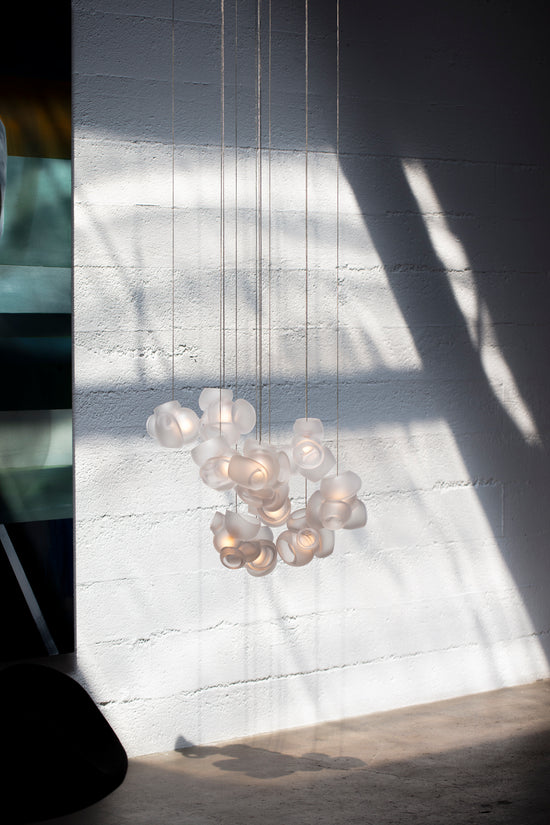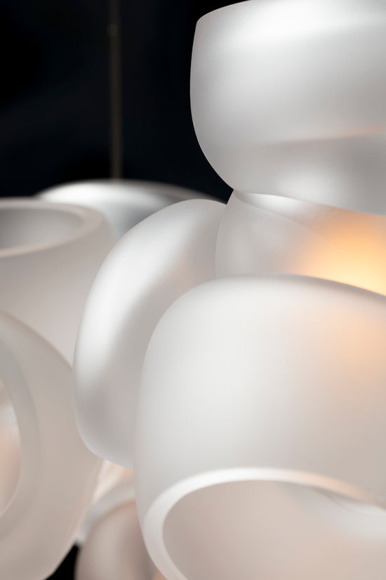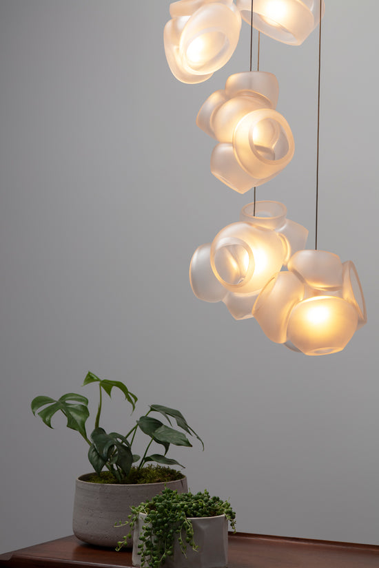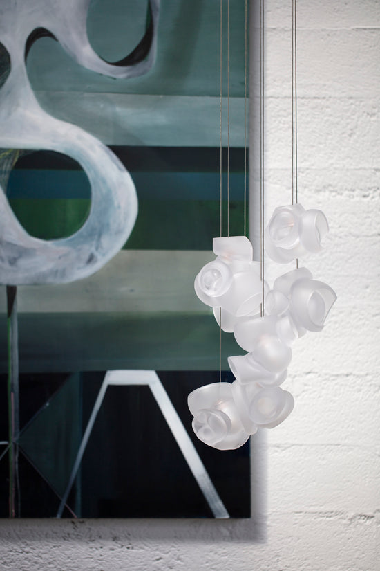 100.11 is comprised of 11 hand blown glass pendants which attach using a fixed length headphone jack connection to either a rectangular, round or square white powder coated canopy.