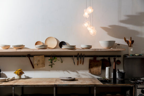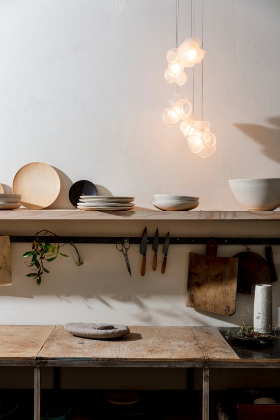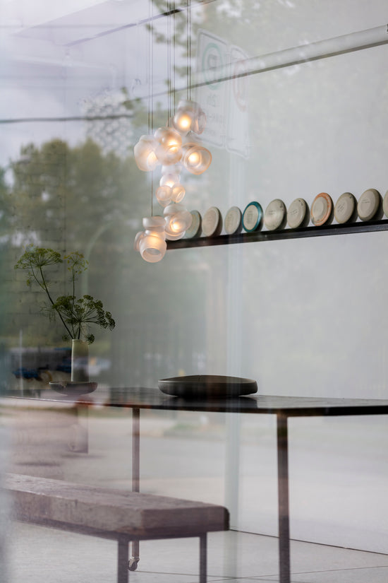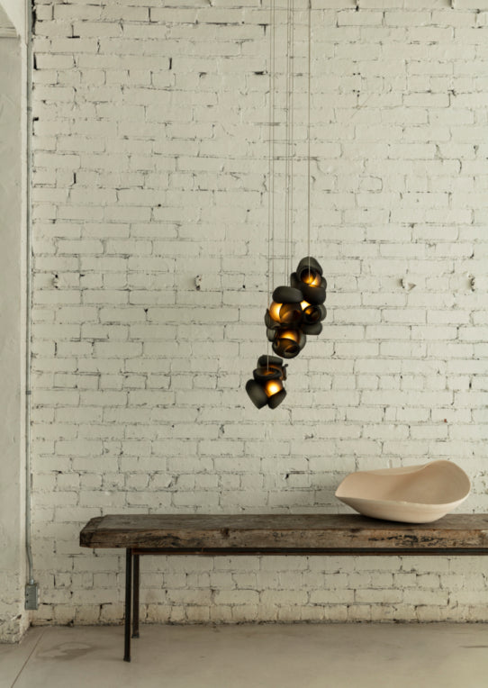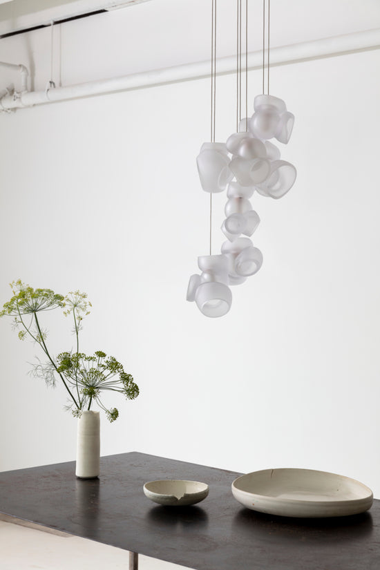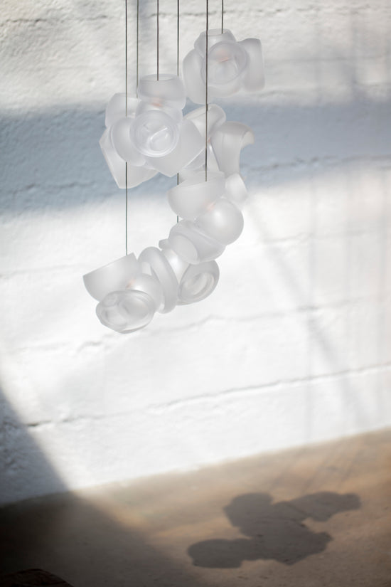 Pendants should be touching or nestled closely together while composing the installation. Please note that the crisp cut edges of the 100 pendants are fragile and can chip if not handled with care when installing and cleaning.