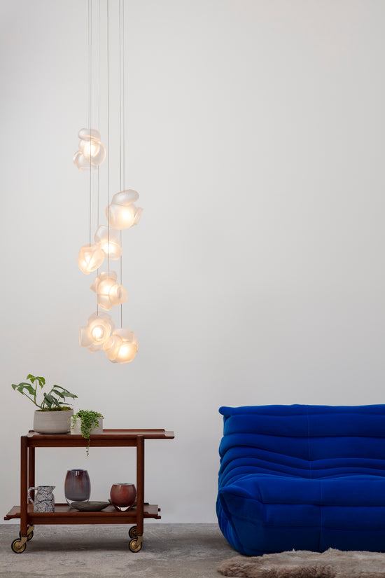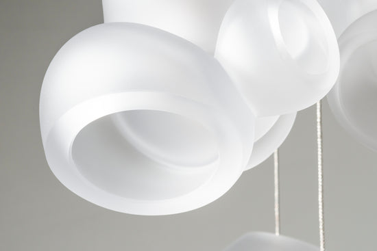 Pendants should be touching or nestled closely together while composing the installation. Please note that the crisp cut edges of the 100 pendants are fragile and can chip if not handled with care when installing and cleaning.