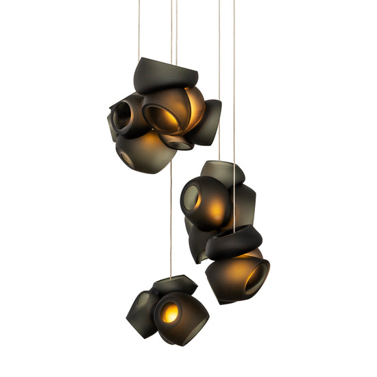 100.5 is comprised of 5 blown glass pendants which attach to a single brushed nickel or white canopy.