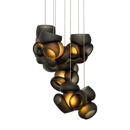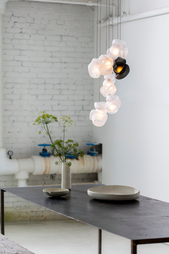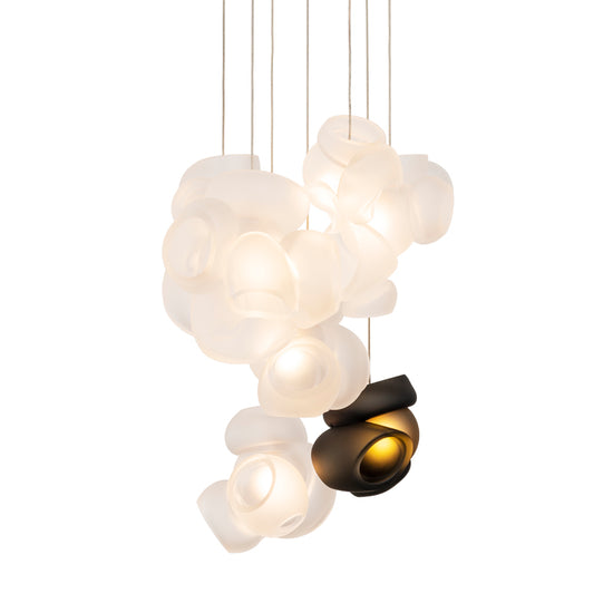 100.7 is comprised of 7 blown glass pendants which attach to a single brushed nickel or white canopy in a random configuration.