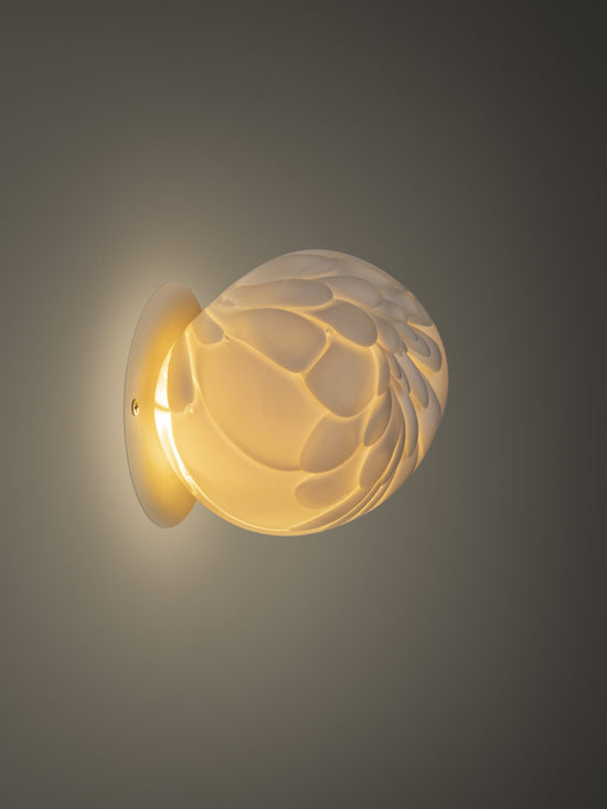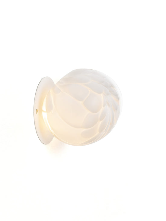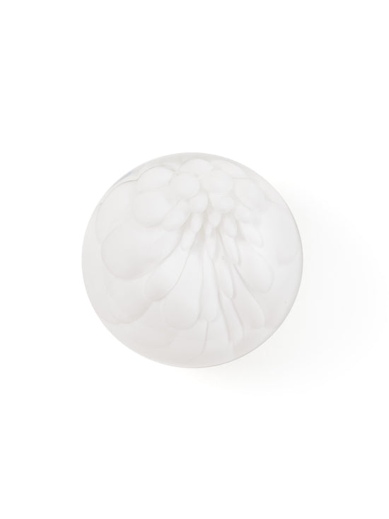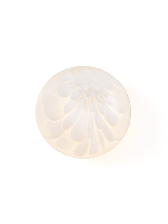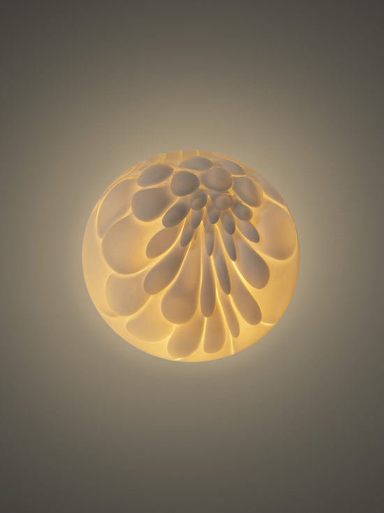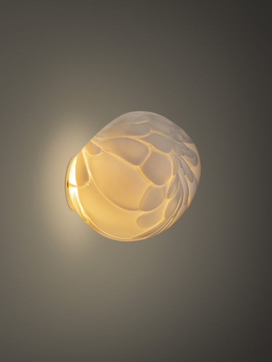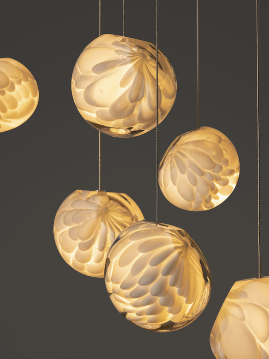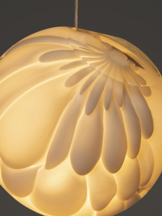 Each 118 contains dozens of tiny feather-like forms in opal glass. When lit from within, these interior intricacies come into even sharper detail.