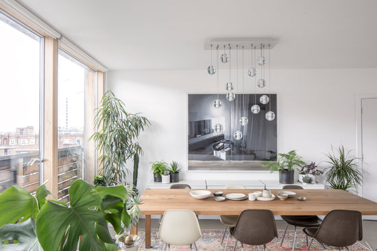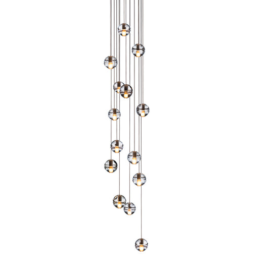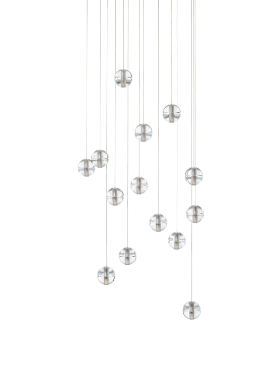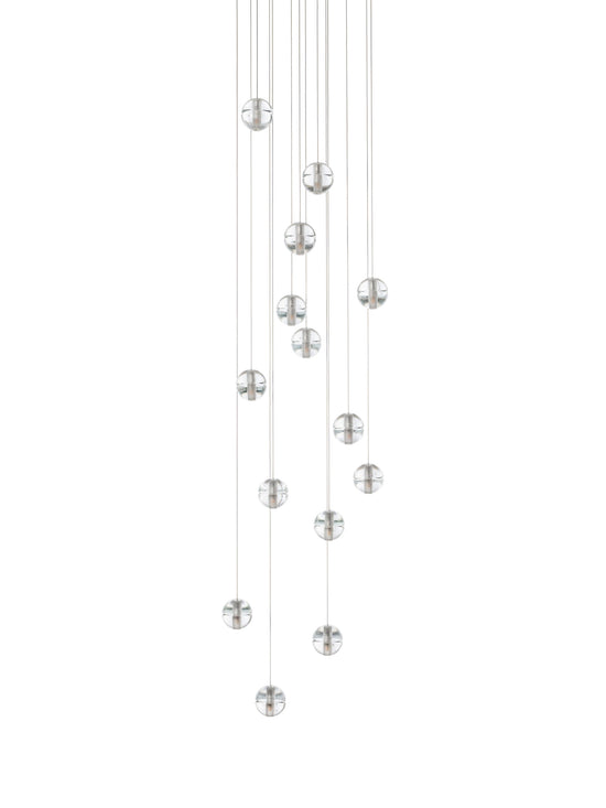 14.14 is comprised of 14 cast glass pendants which attach using a fixed-length connector to a white powder-coated canopy.