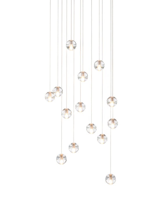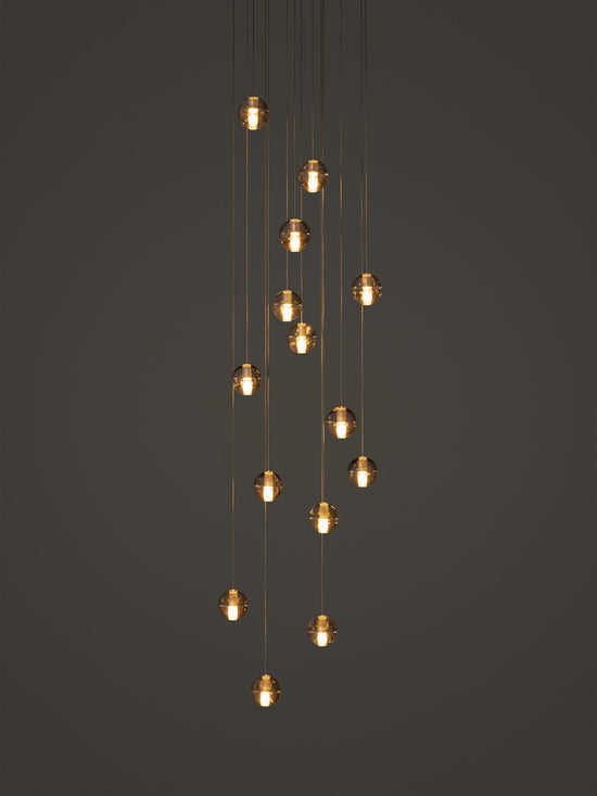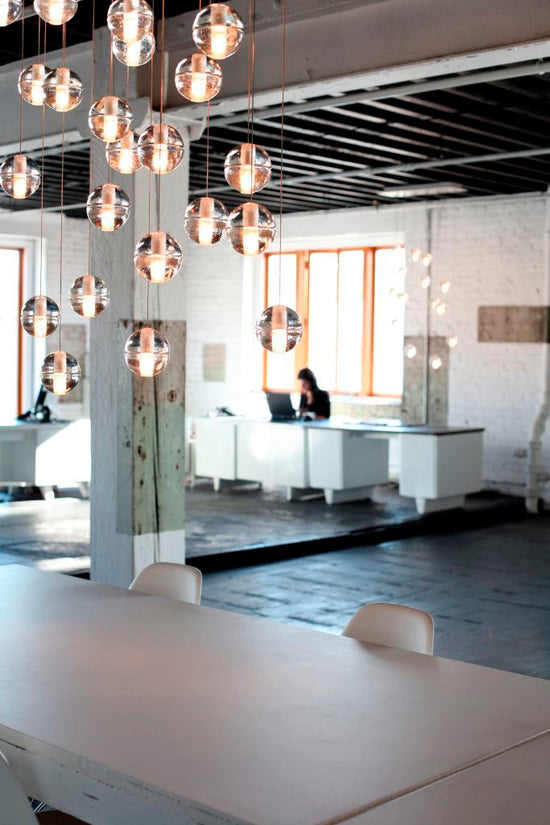 14 is an articulated, cast glass sphere with a frosted cylindrical void that houses either a low-voltage xenon or LED lamp. Individual pendants are visually subtle, but gain an atmospheric quality when multiplied and clustered in groups.
