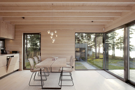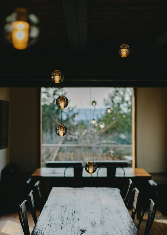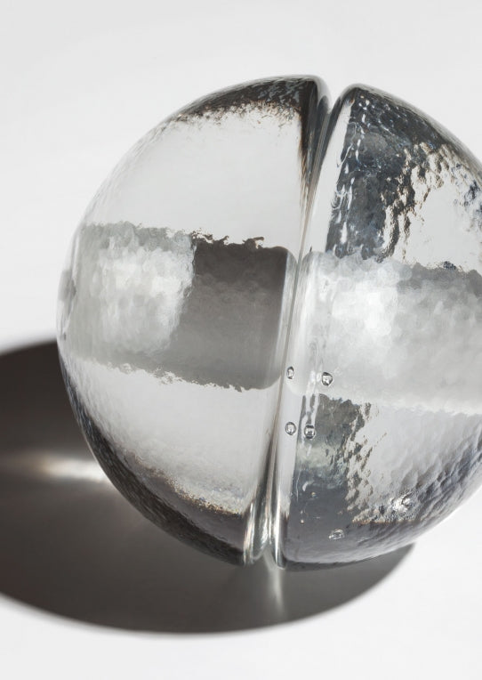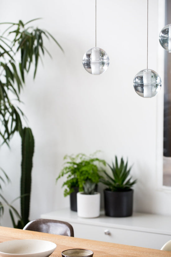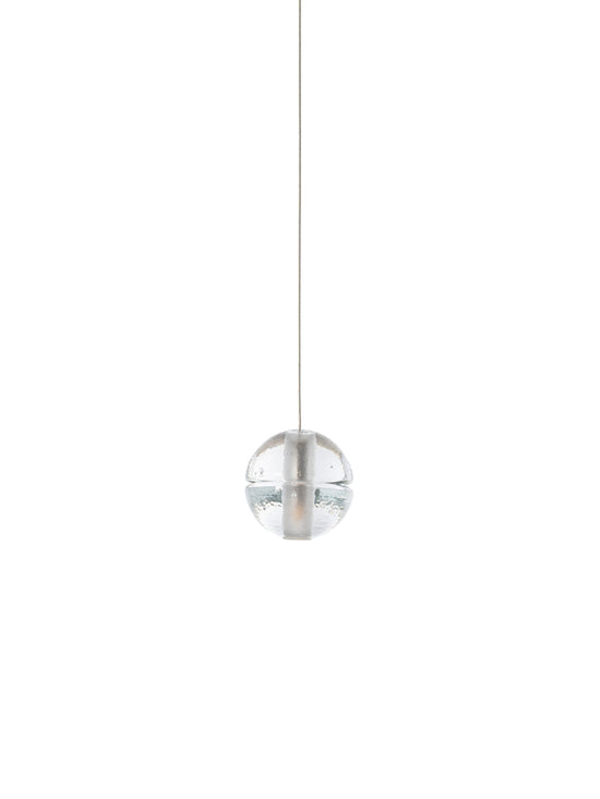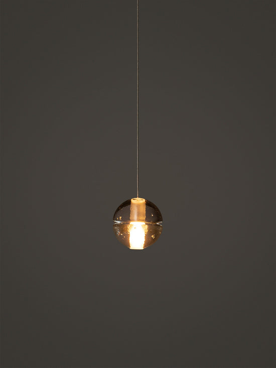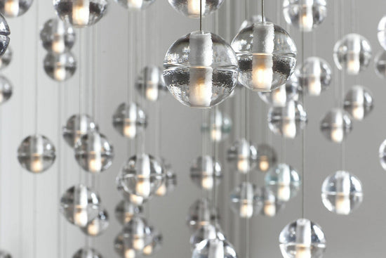 14 is an articulated, cast glass sphere with a frosted cylindrical void that houses either a low-voltage xenon or LED lamp. Individual pendants are visually subtle, but gain an atmospheric quality when multiplied and clustered in groups.
