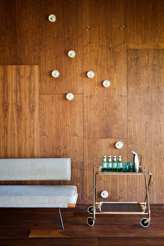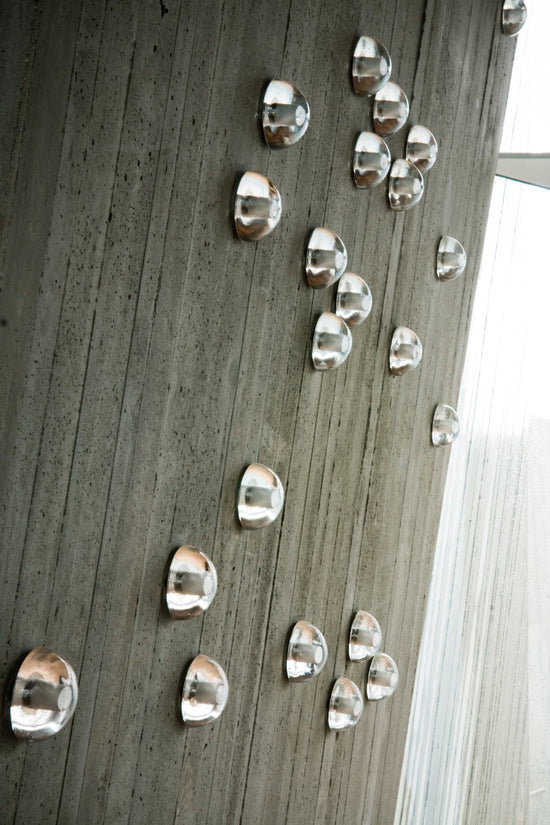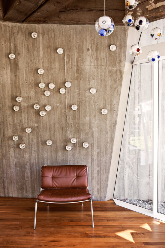 Mounted on a white powder-coated base, individual pendants can directly attach to either the ceiling or the wall.