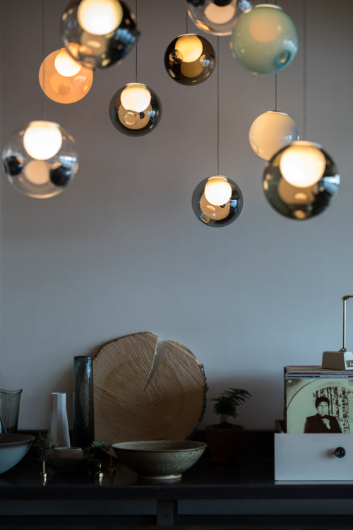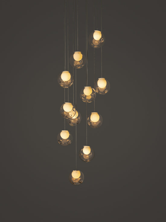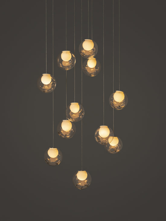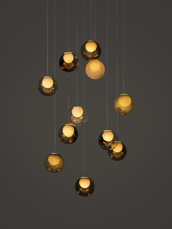 28 results from an innovative fabrication process that manipulates both the temperature and the direction of air flow into blown glass. The result is a slightly distorted sphere with an interior landscape of satellite shapes, including an opaque milk glass diffuser that houses either a low-voltage xenon or LED lamp.