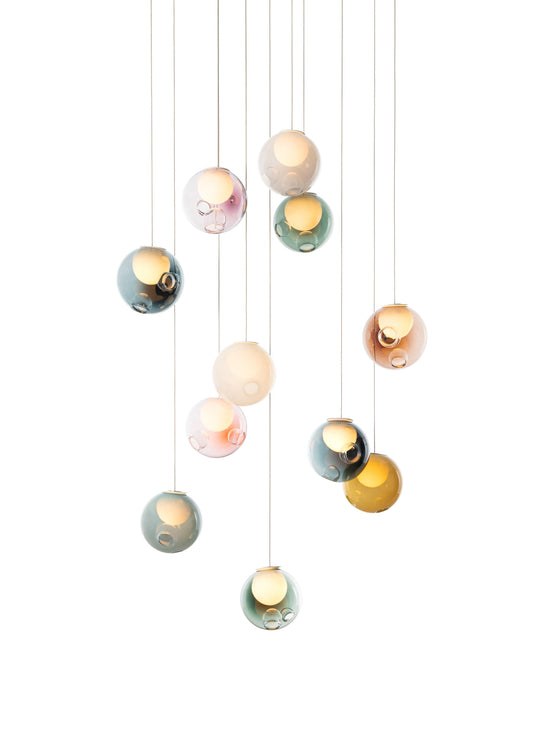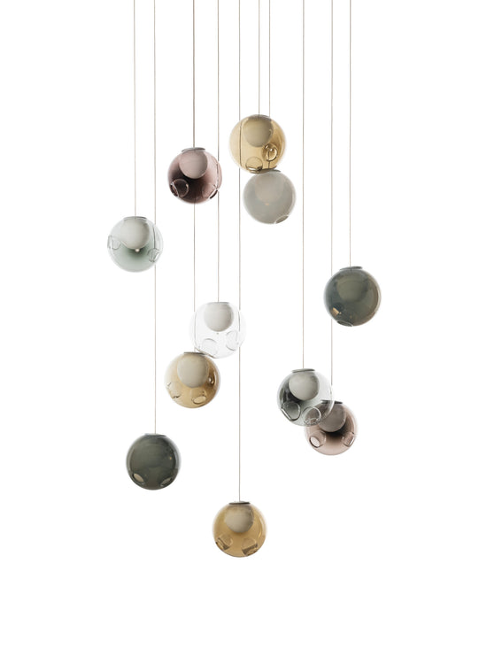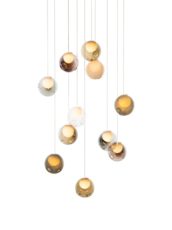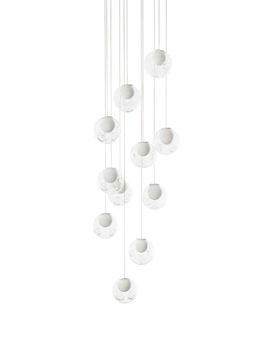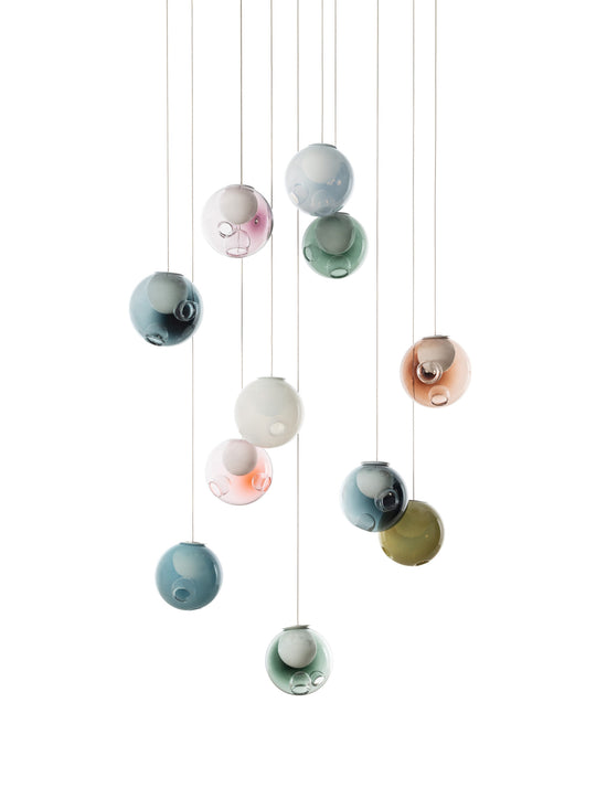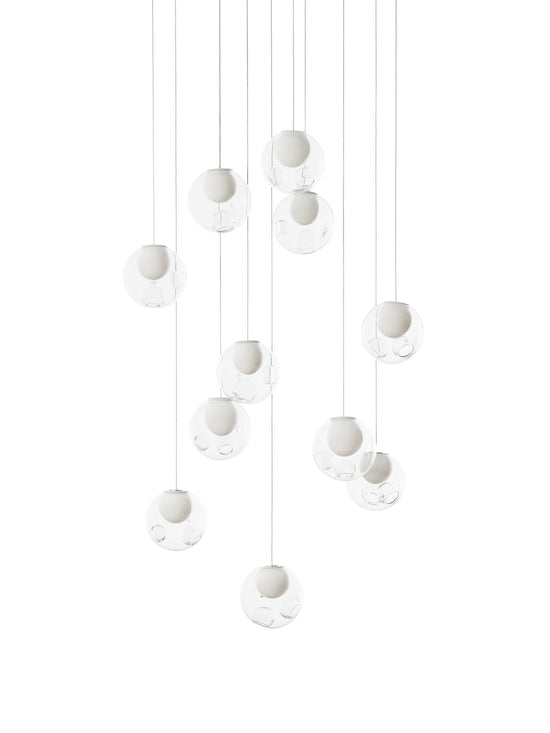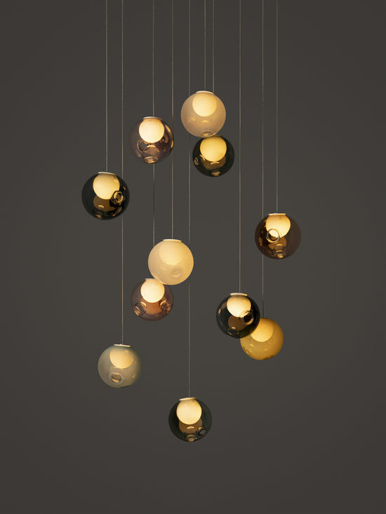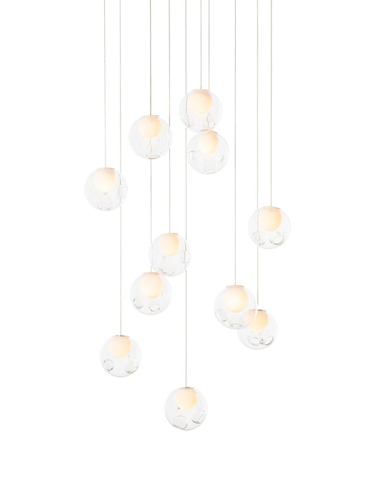 28.11 is comprised of 11 hand blown glass pendants which attach using a fixed length jack connection to a white powder coated canopy.