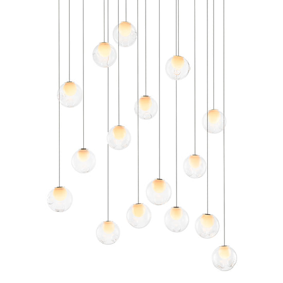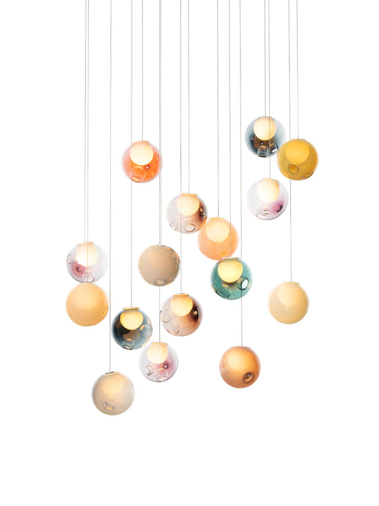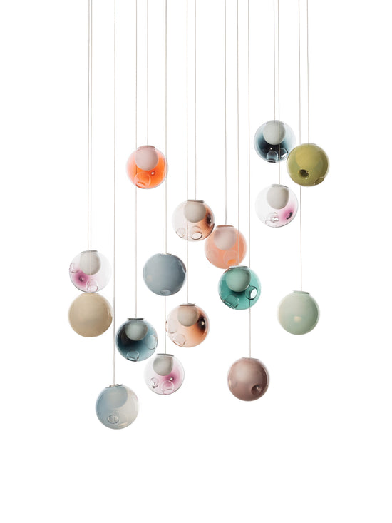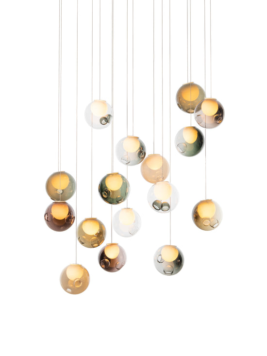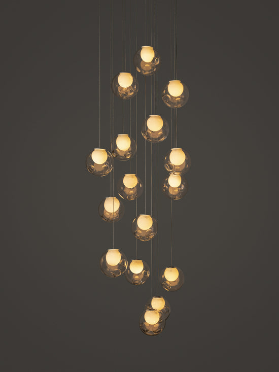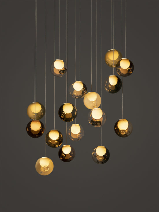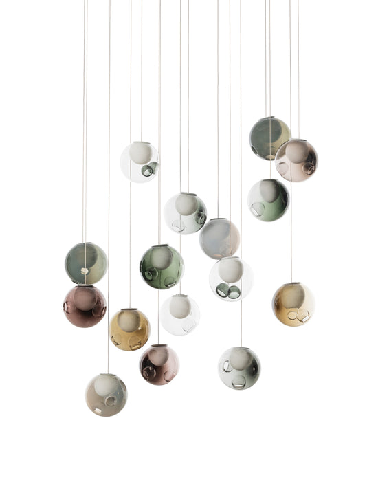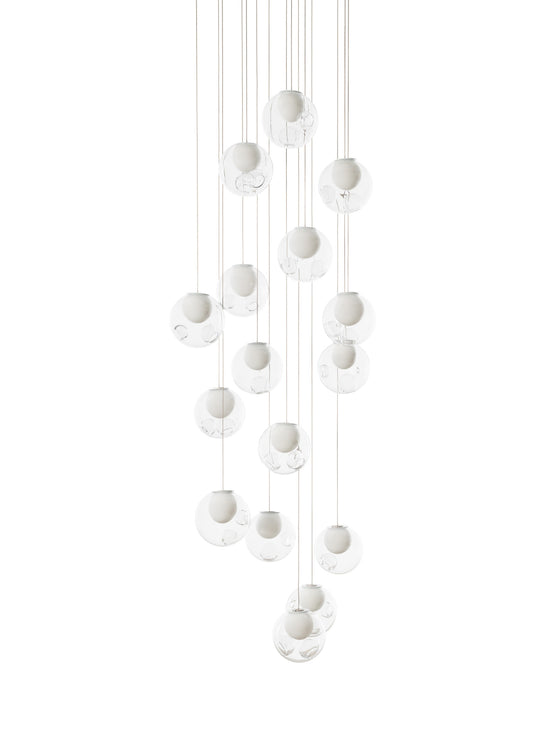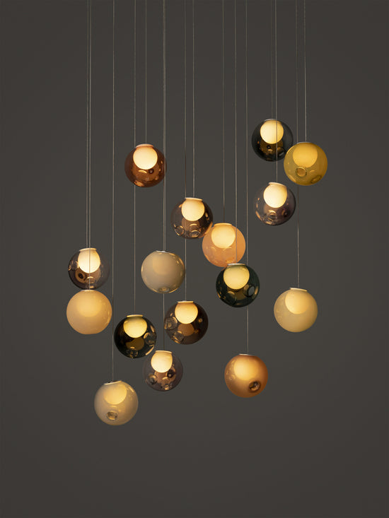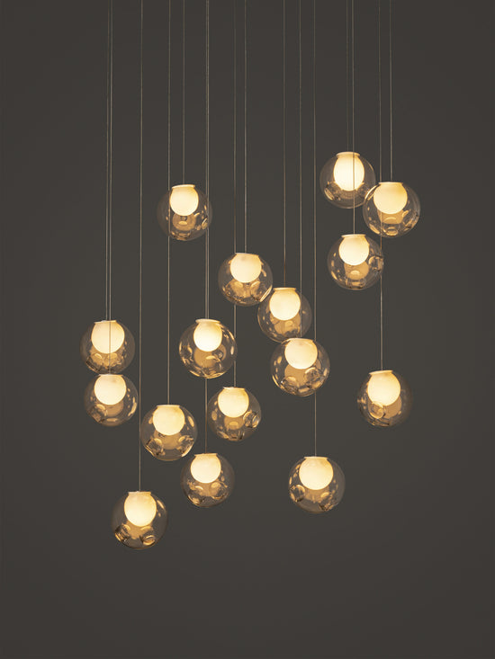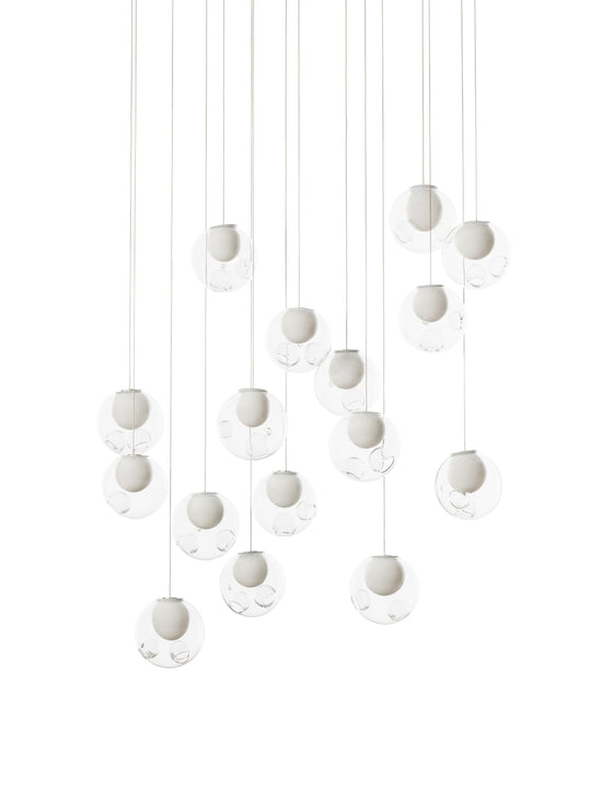 28.16 is comprised of 16 hand-blown glass pendants which attach using a fixed length jack connection to a white powder-coated canopy.