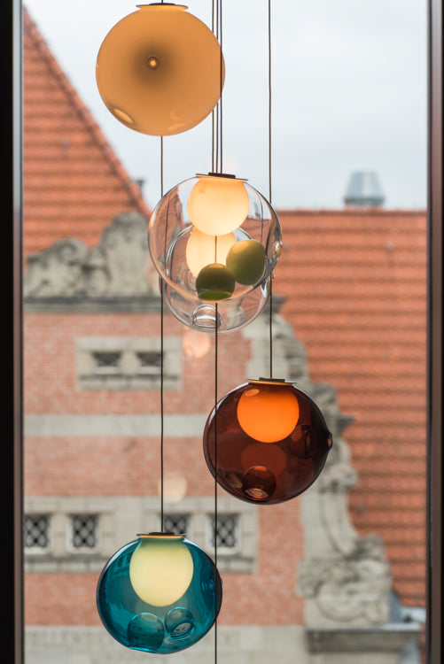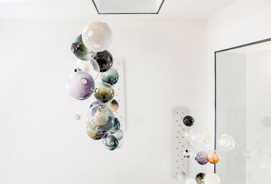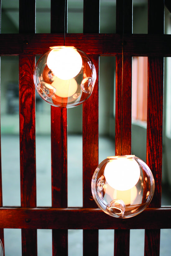 28 results from an innovative fabrication process that manipulates both the temperature and the direction of air flow into blown glass. The result is a slightly distorted sphere with an interior landscape of satellite shapes, including an opaque milk glass diffuser that houses either a low-voltage xenon or LED lamp.
