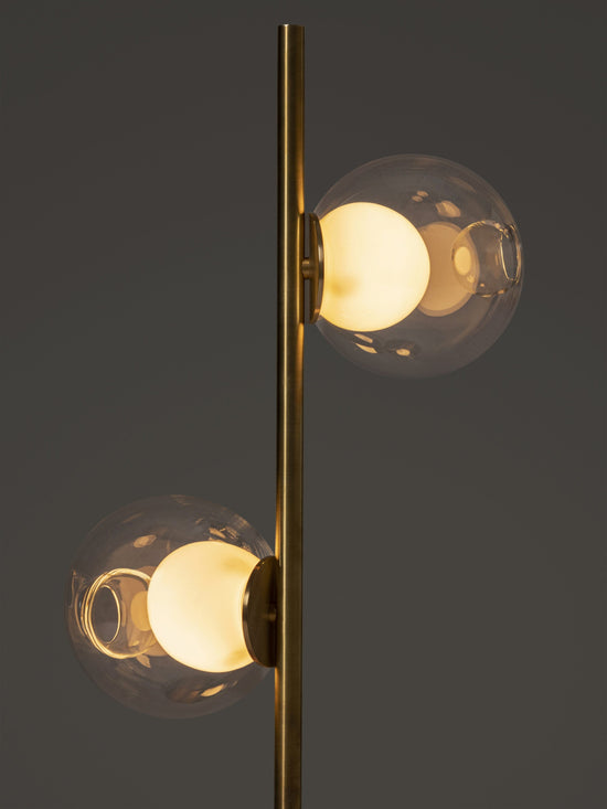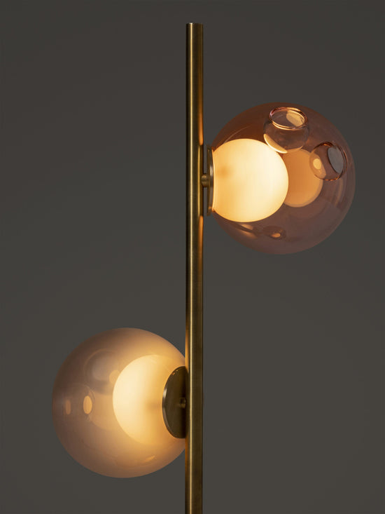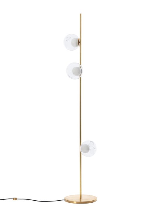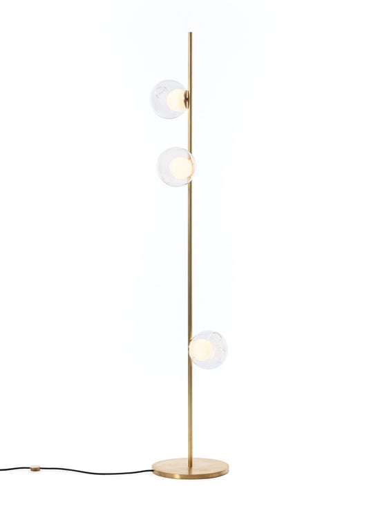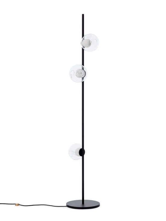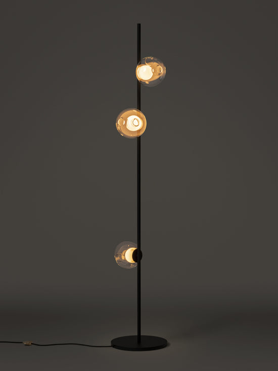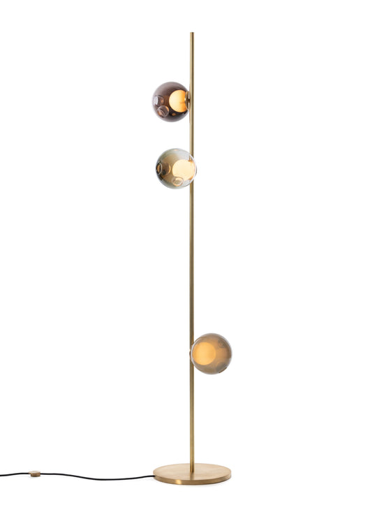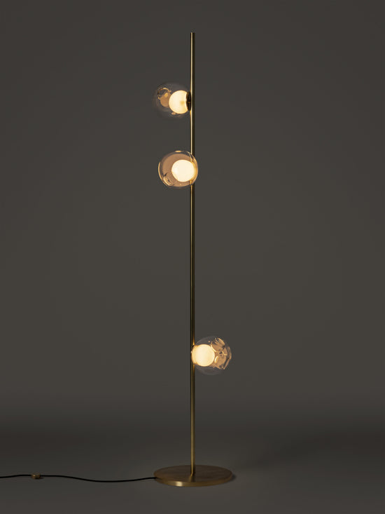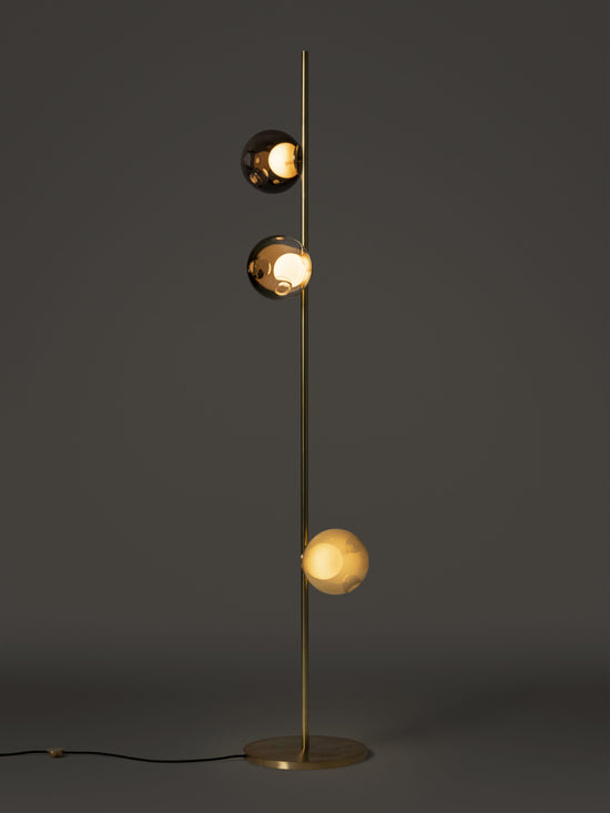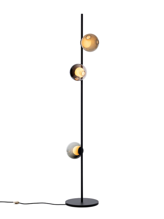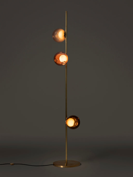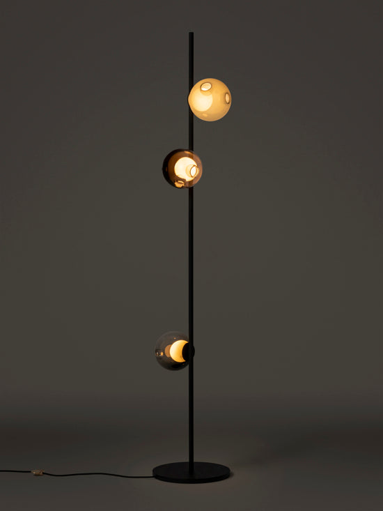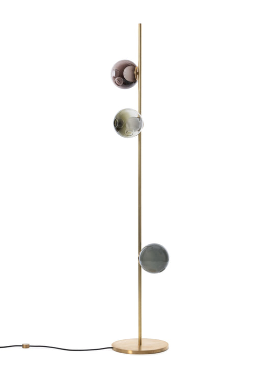 28.3 is comprised of 3 hand blown glass pendants mounted on a long stem (1.8m) available in black powder coated or brass finish with a 350mm diameter base.
