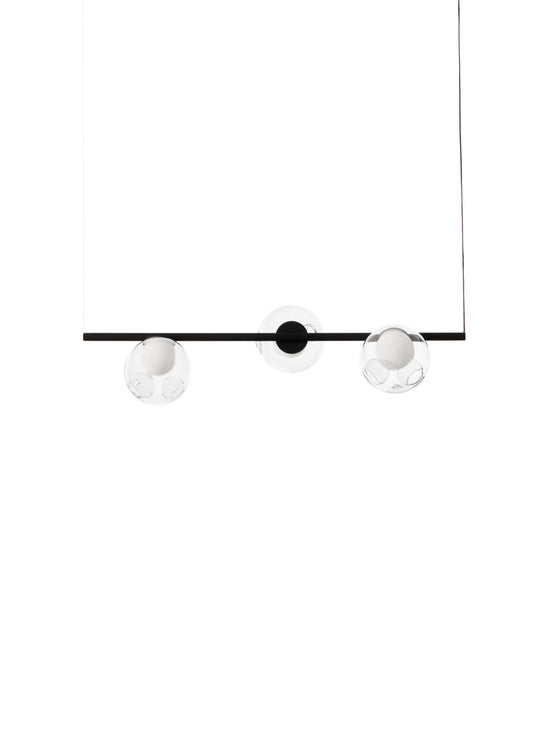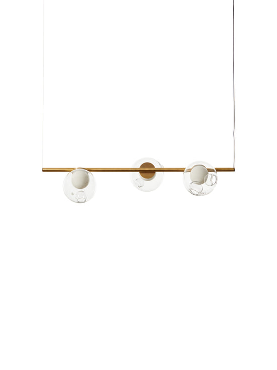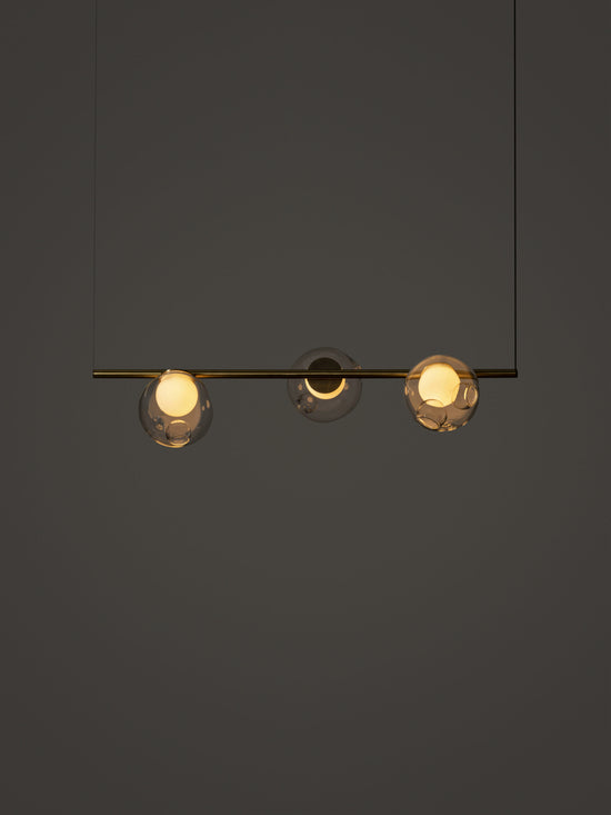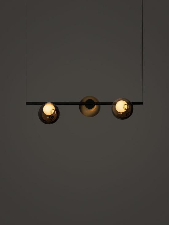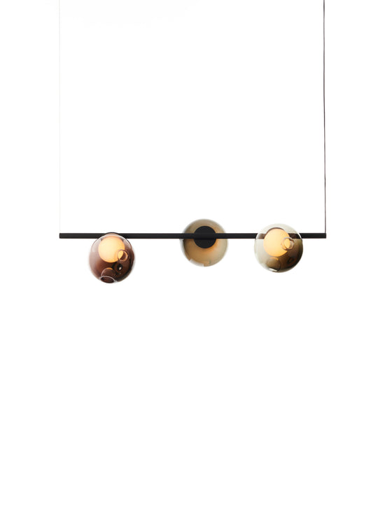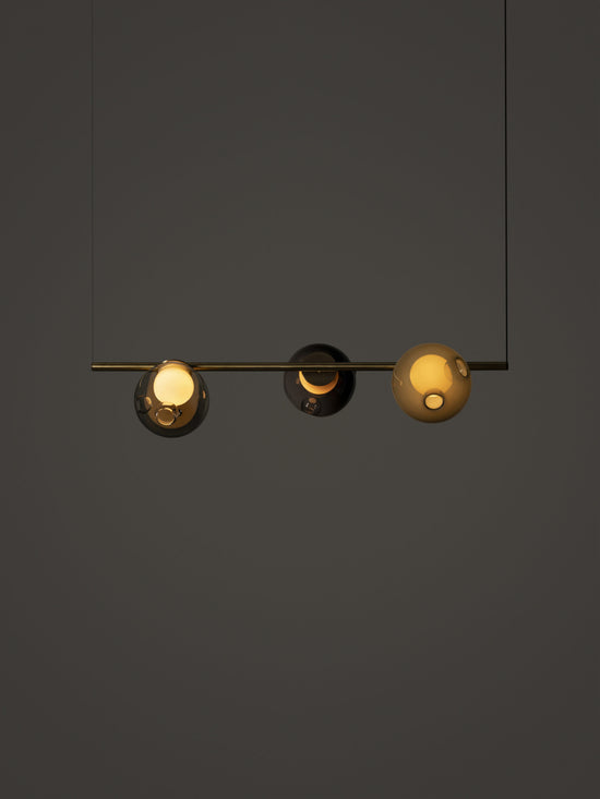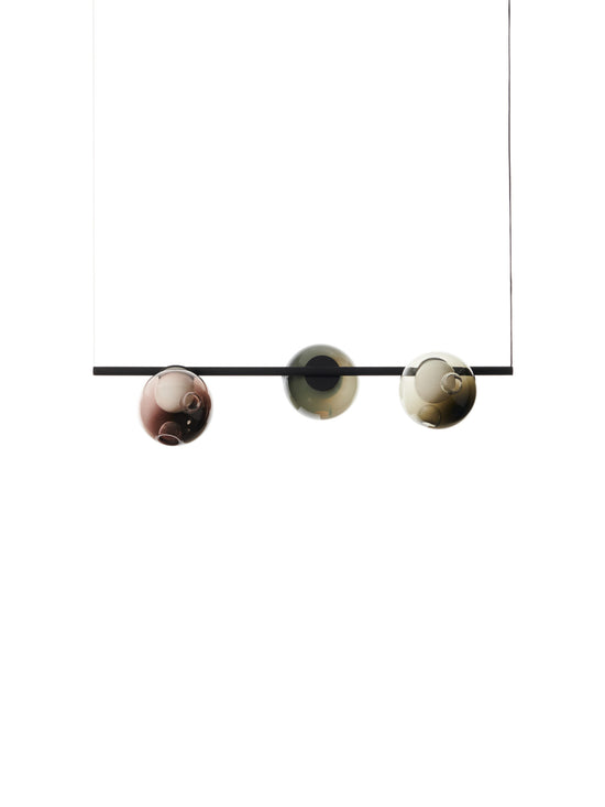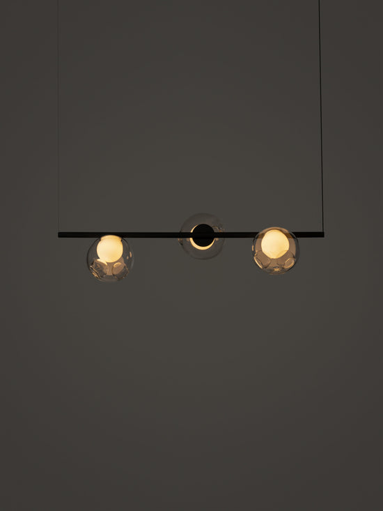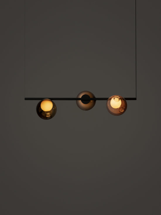28.3 is composed of three hand-blown glass pendants mounted on a short stem (0.9m), available in a black powder-coated or brass finish. The stem attaches to a single canopy and is supported by suspension cables.