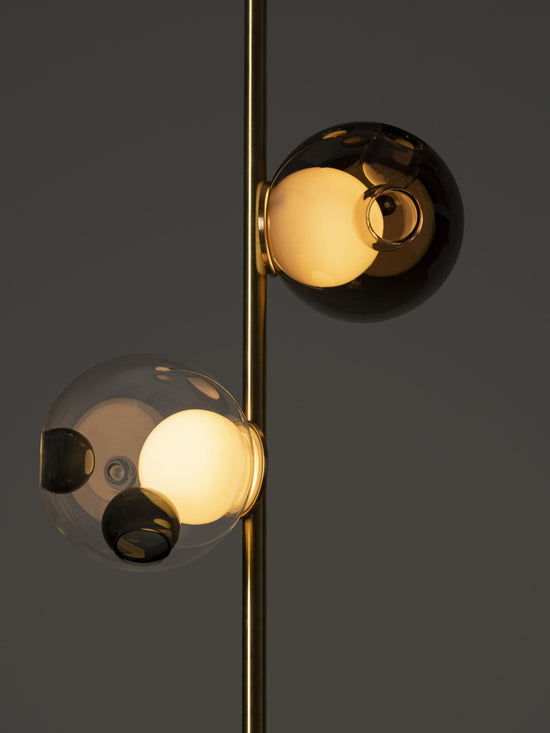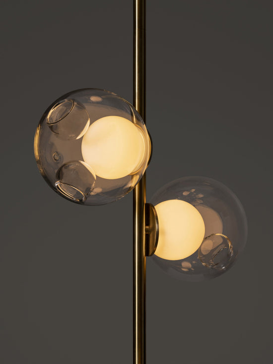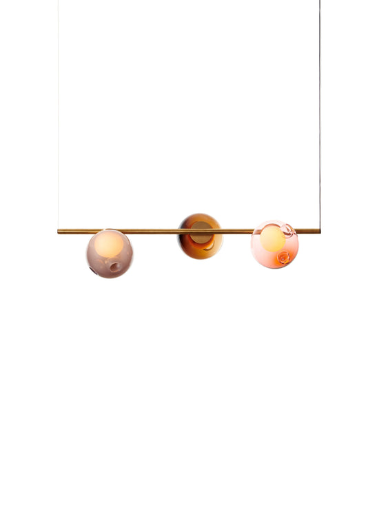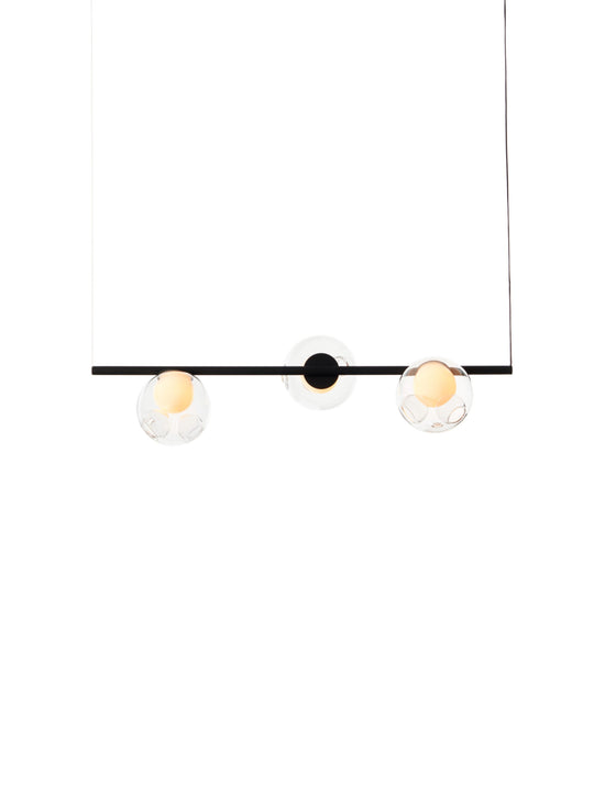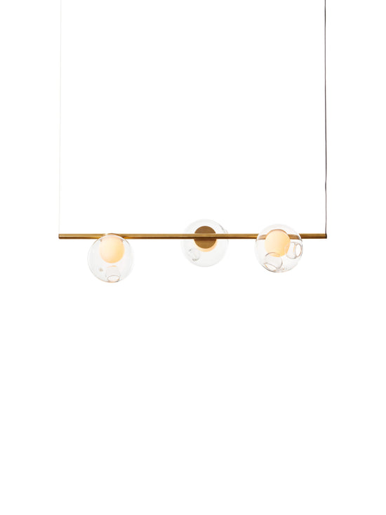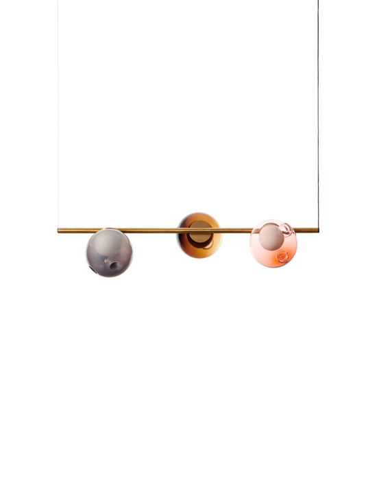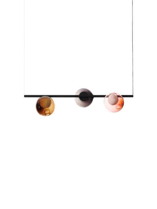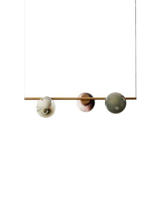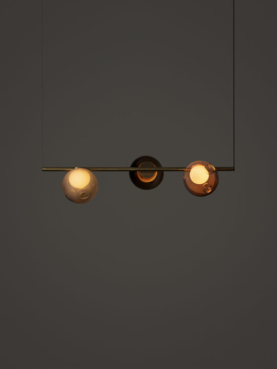 28.3 is composed of three hand-blown glass pendants mounted on a short stem (0.9m), available in a black powder-coated or brass finish. The stem attaches to a single canopy and is supported by suspension cables.