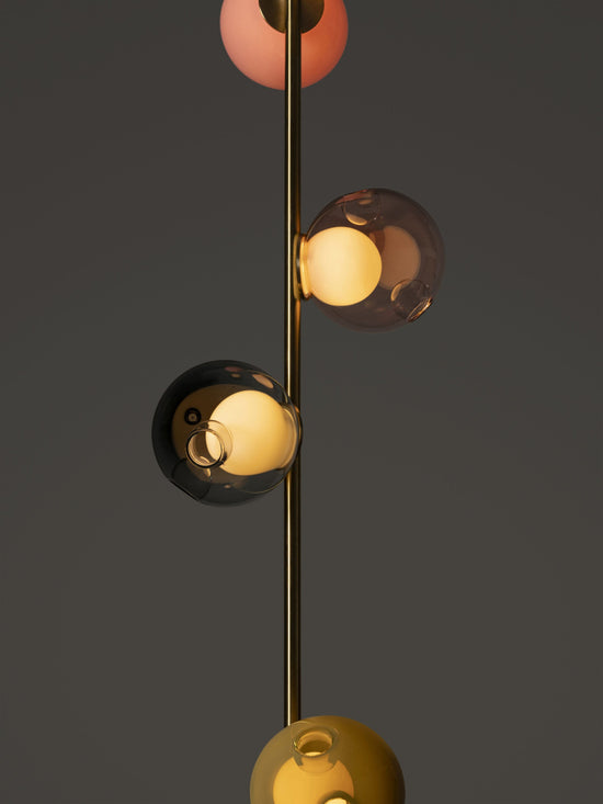 Standard 28s are made with clear glass exterior spheres and milk white interior lamp holder cavities. 28s are possible with infinite versatility in colour compositions, sizes and shapes.