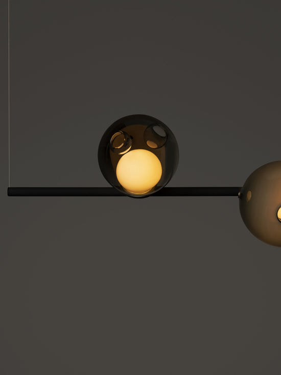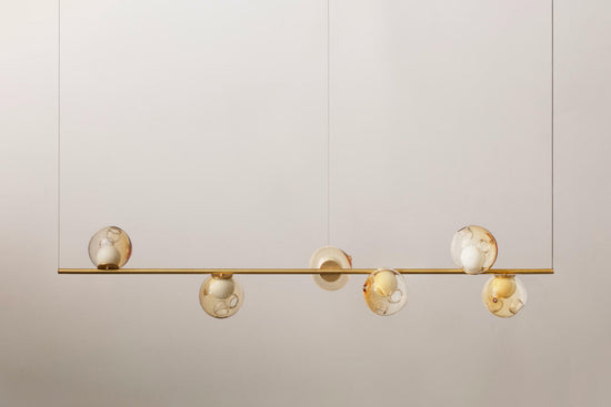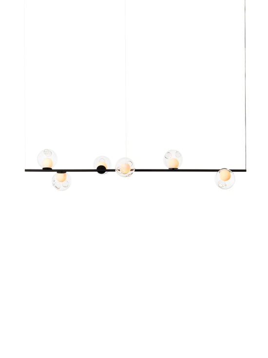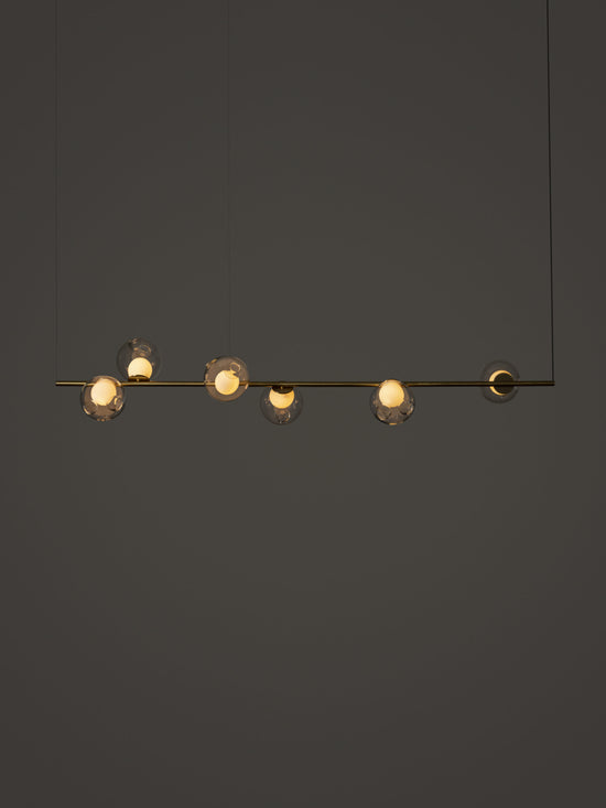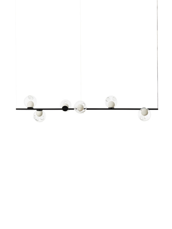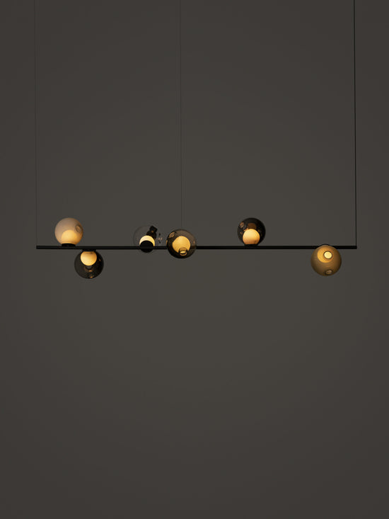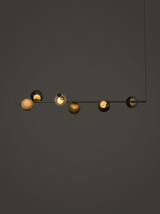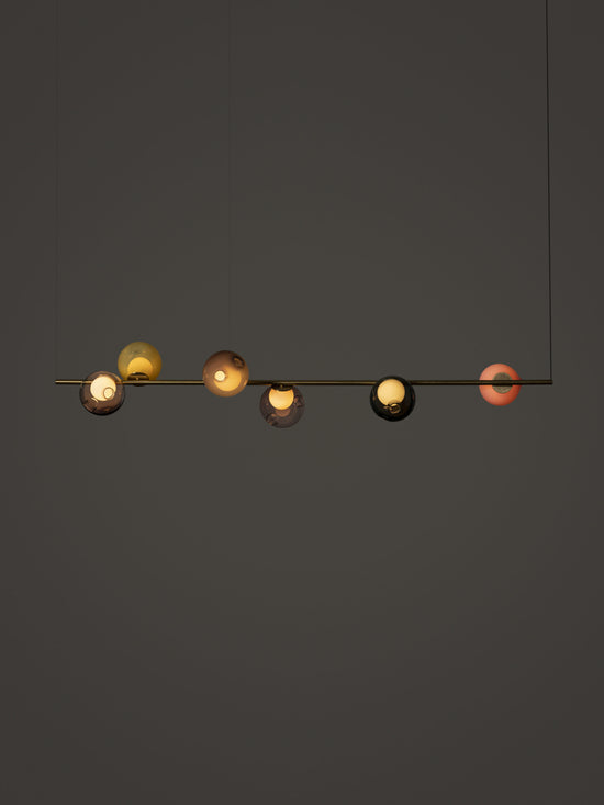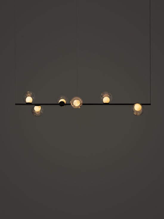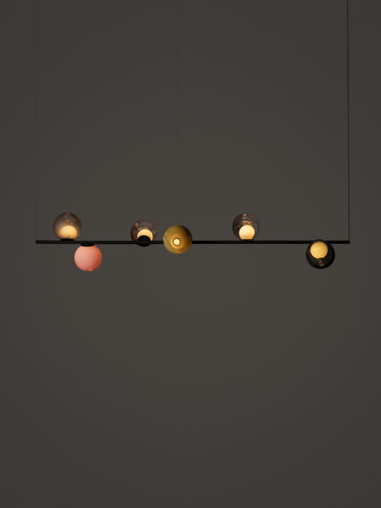 28.6 is composed of six hand-blown glass pendants mounted on a long stem (1.8m), available in a black powder-coated or brass finish. The stem attaches to a single canopy and is supported by suspension cables.