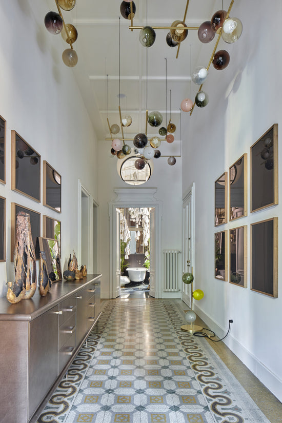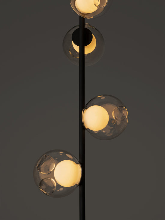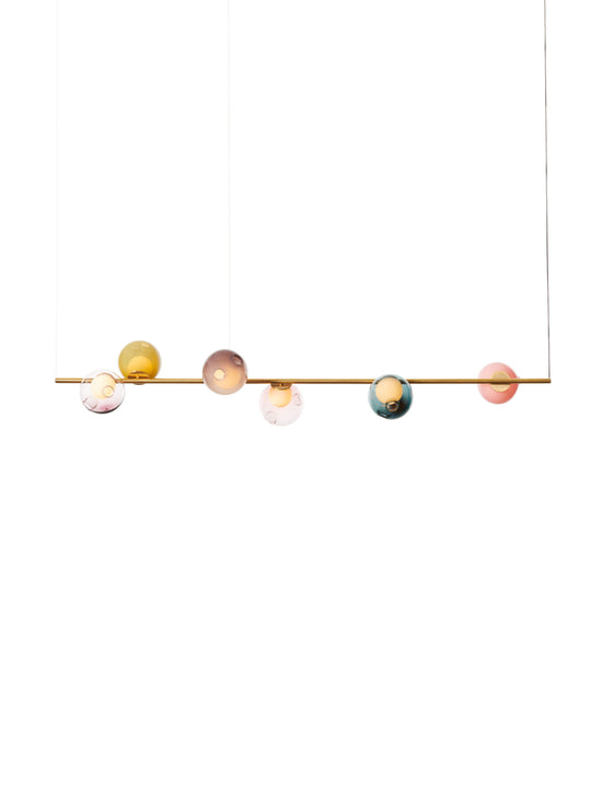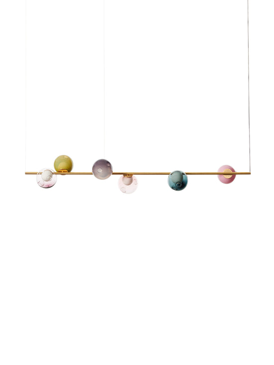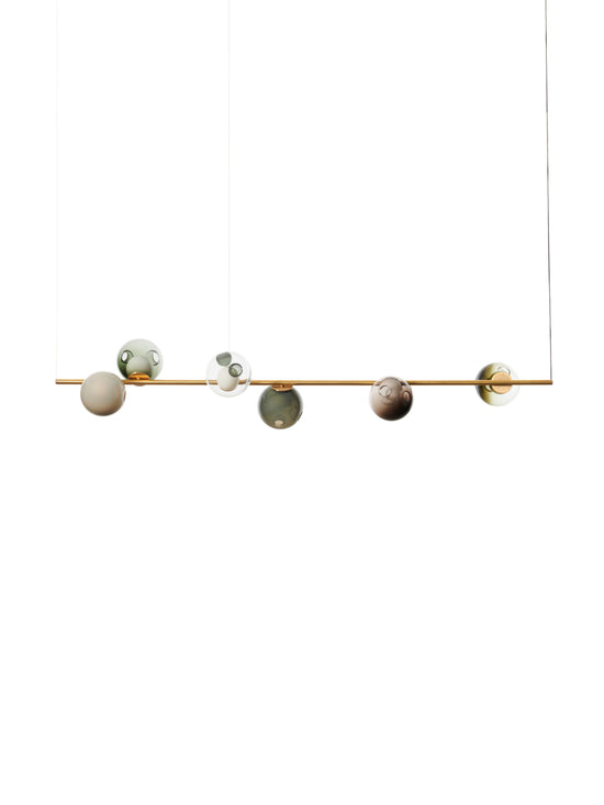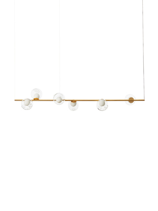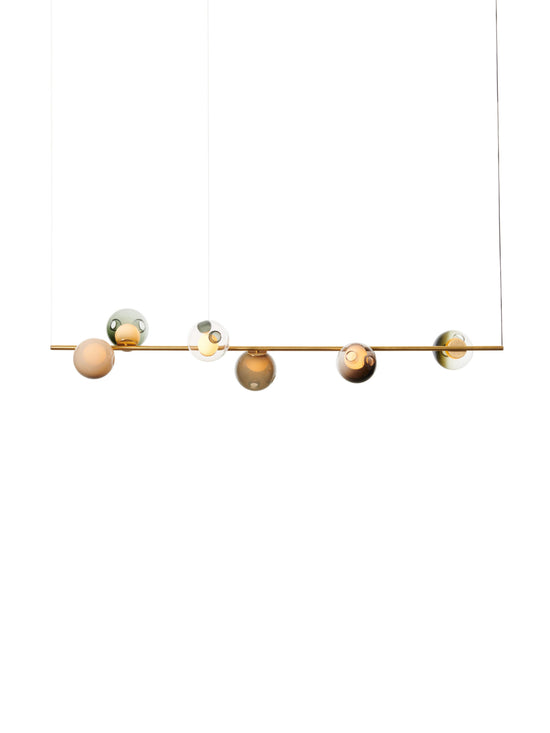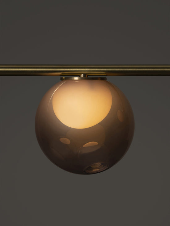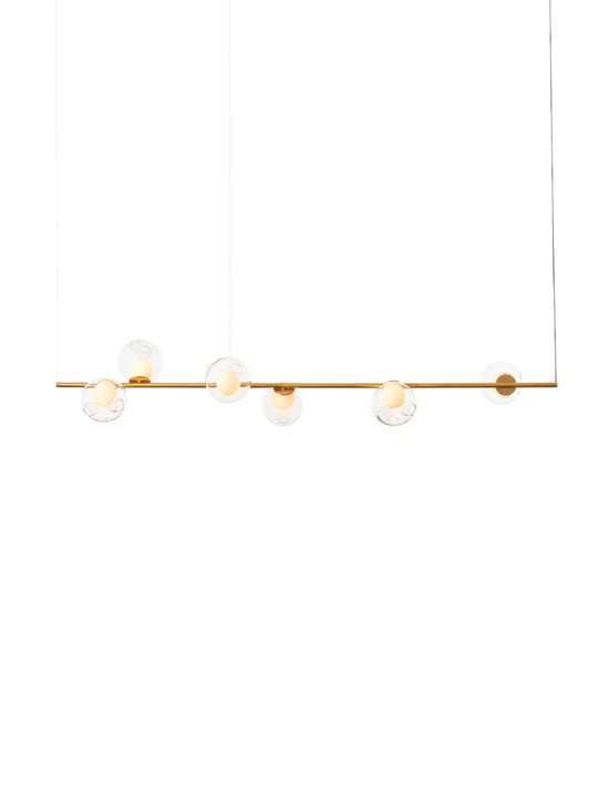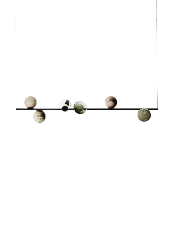 28.6 is composed of six hand-blown glass pendants mounted on a long stem (1.8m), available in a black powder-coated or brass finish. The stem attaches to a single canopy and is supported by suspension cables.