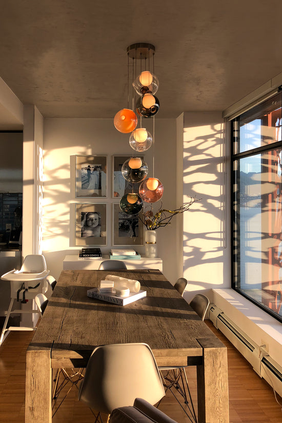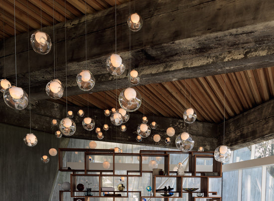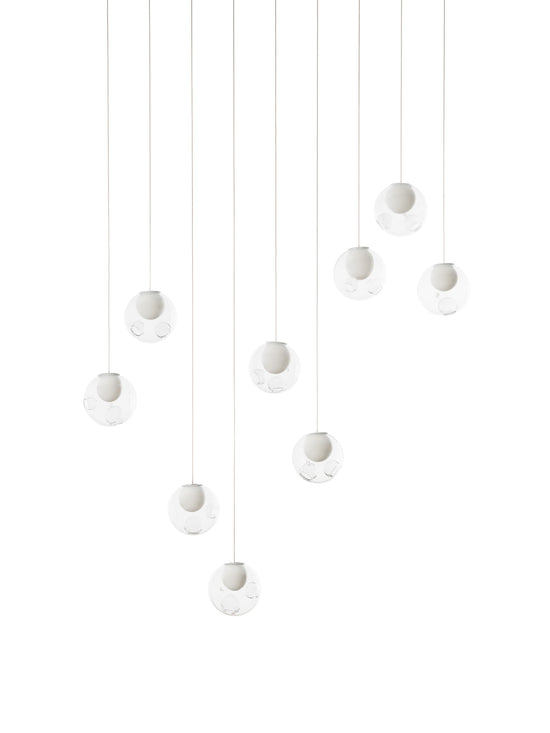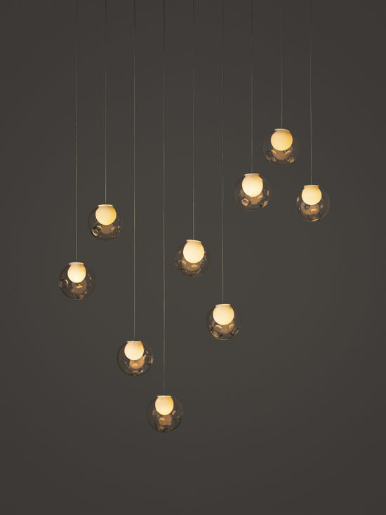 28.9 is comprised of 9 hand-blown glass pendants which attach to a single white linear canopy.
