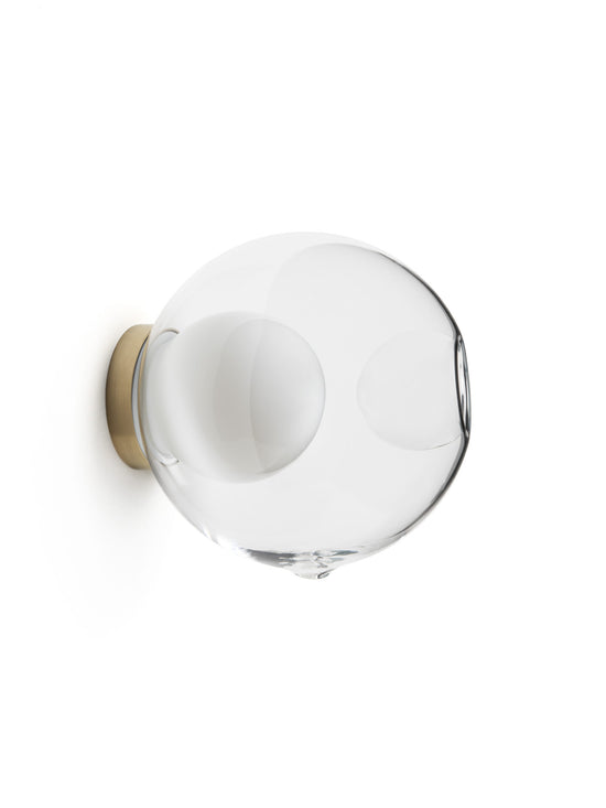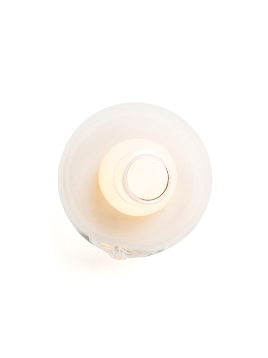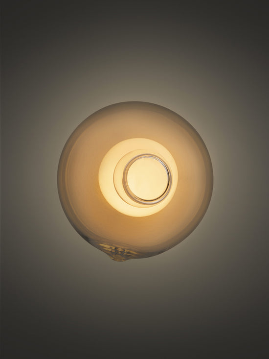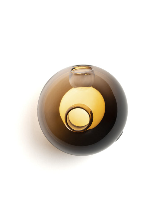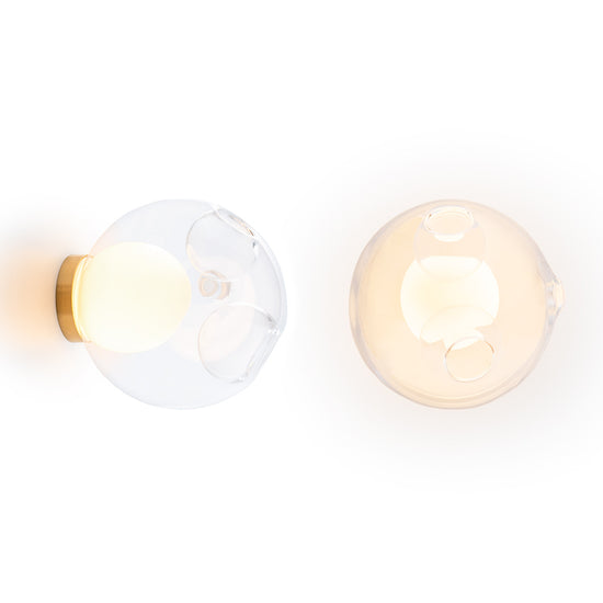 28s Brass is a single hand-blown glass pendant with a brass cylinder base, that can be wall or ceiling mounted.
