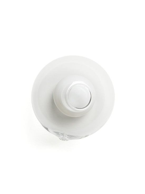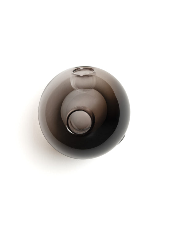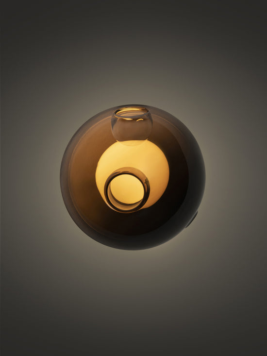 Multiple spheres in milky, clear, and coloured glass meet inside 28. This complex form takes shape through our glassblowers’ play with airflow and heat.