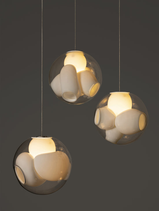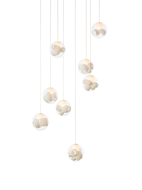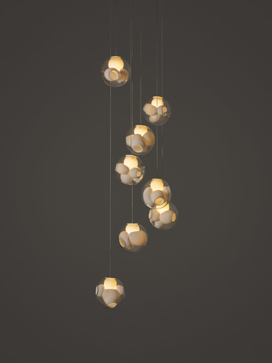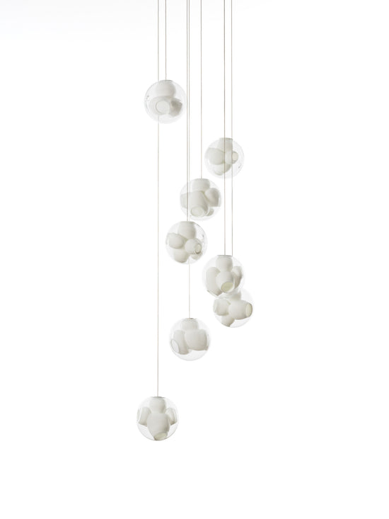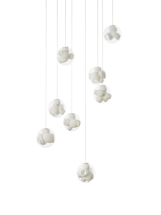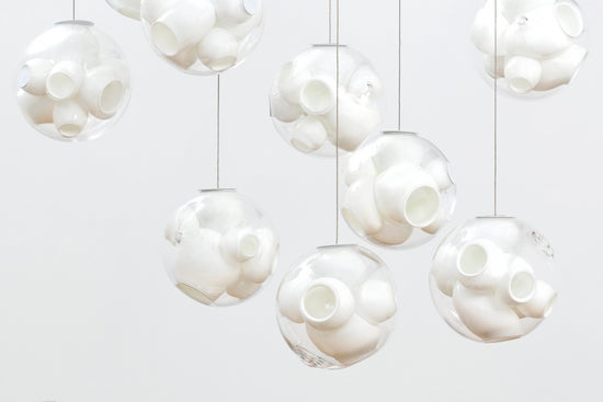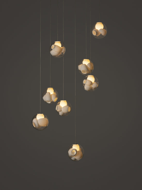 38.8V is composed of eight large hand-blown glass pendants that attach to a white powder-coated canopy using a fixed length jack connection.