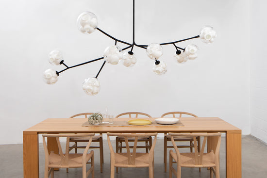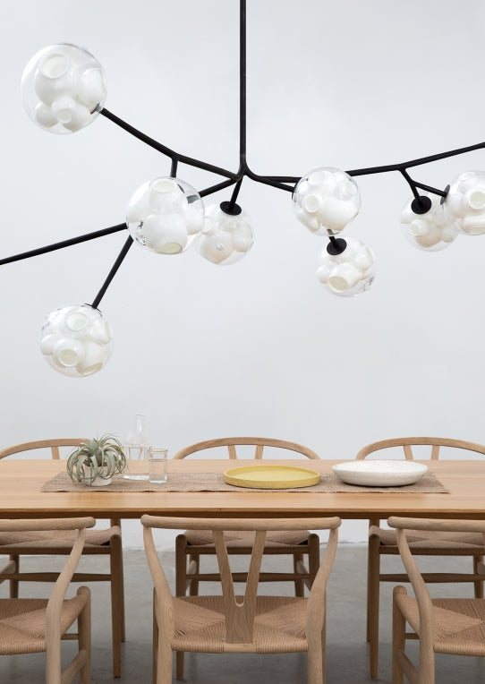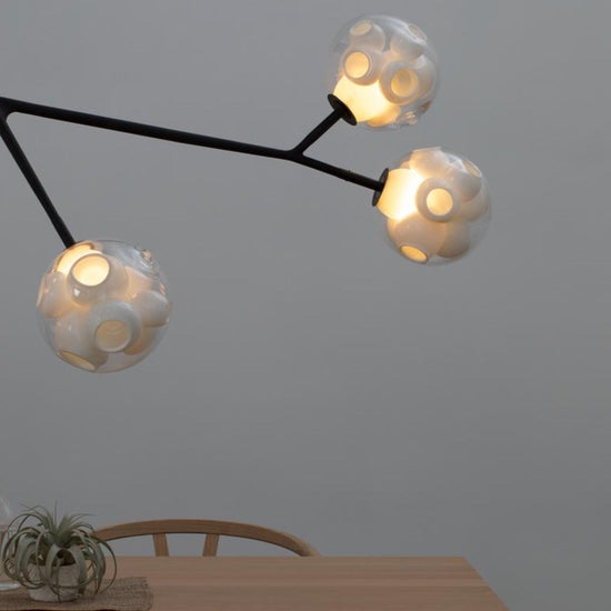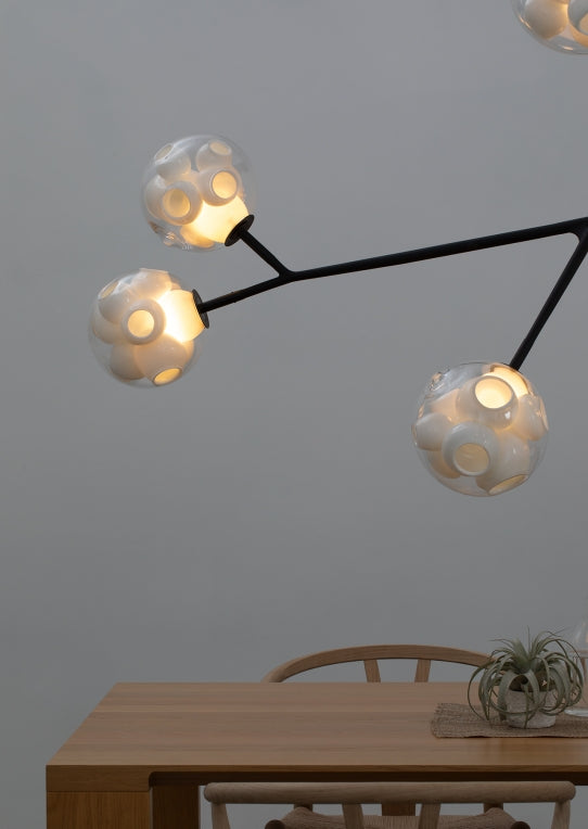 38V is a variant of the original 38 series where a large glass sphere is blown with a multitude of haphazard interior cavities, which intersect and collide in unpredictable ways. 38V is smaller, lighter and suspended on a steel armature system. The interior cavities can be filled with plants or left empty.