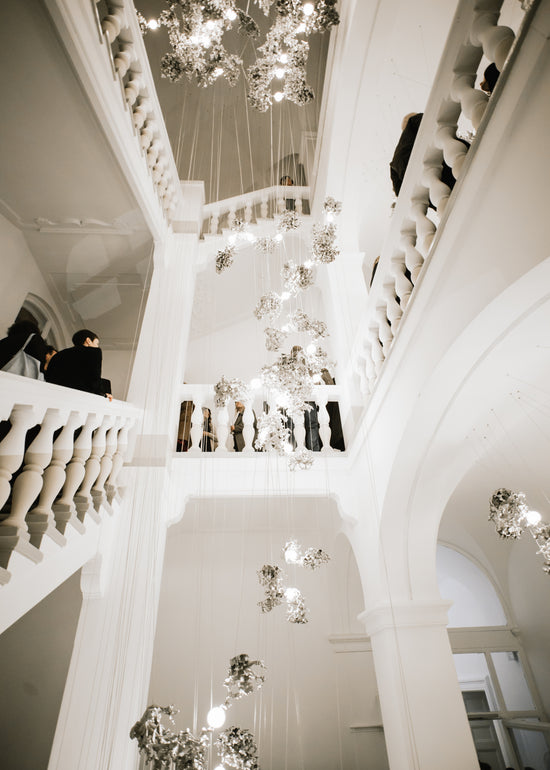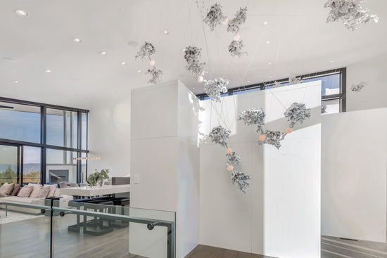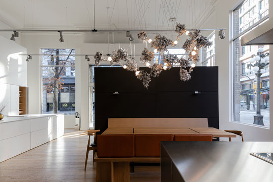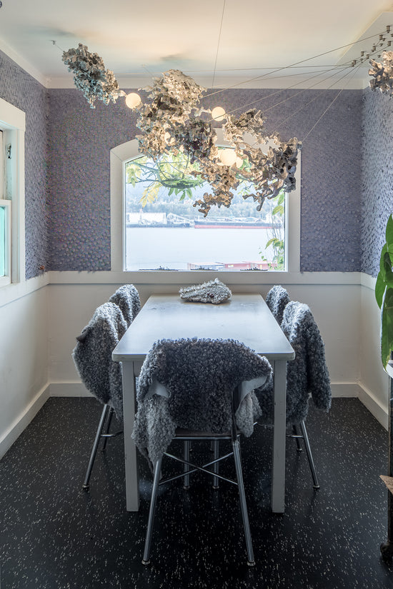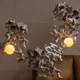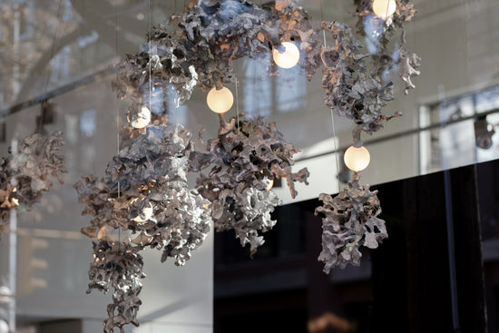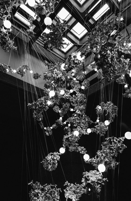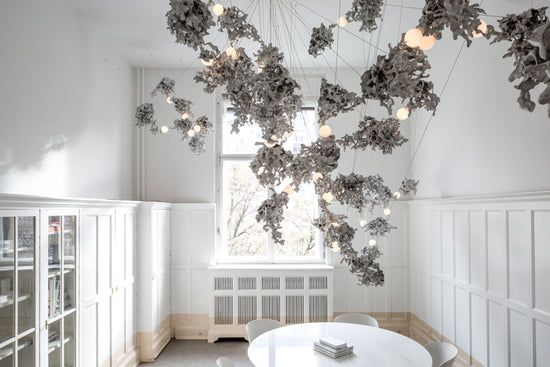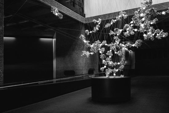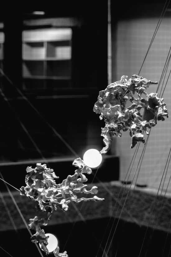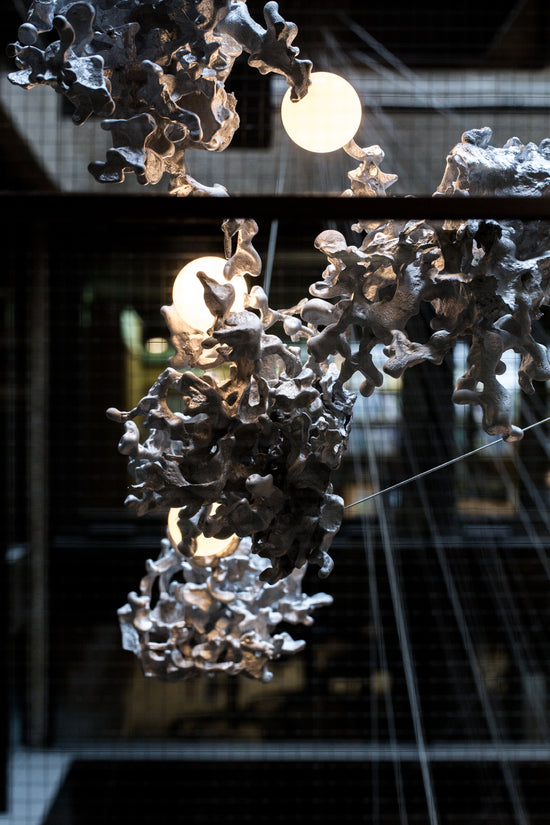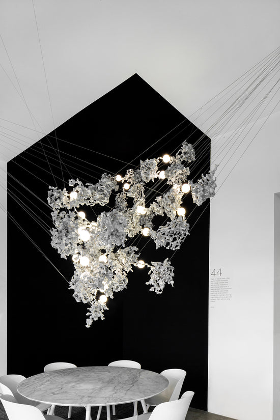 Each 44 results from a free pour of molten aluminium into a large canister filled with rock-like modules of resin-impregnated sand, a waste product of conventional sand casting. Low voltage electricity is transmitted through the castings, allowing a light source to be suspended between them without using cables.