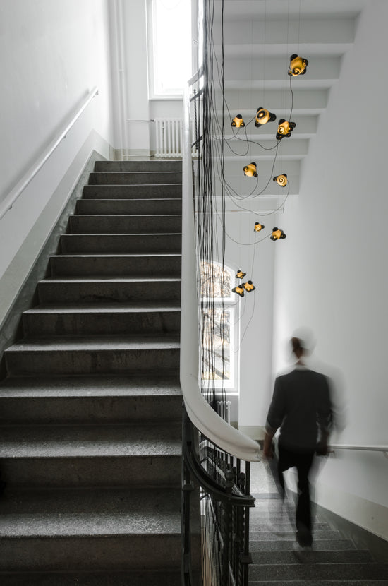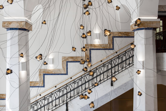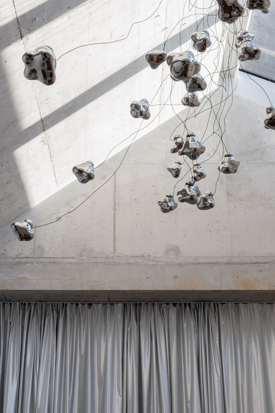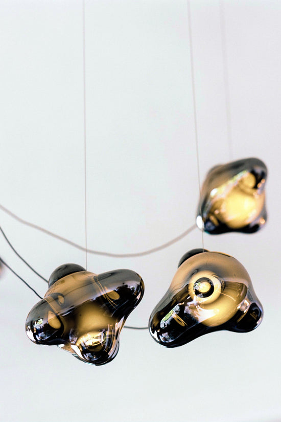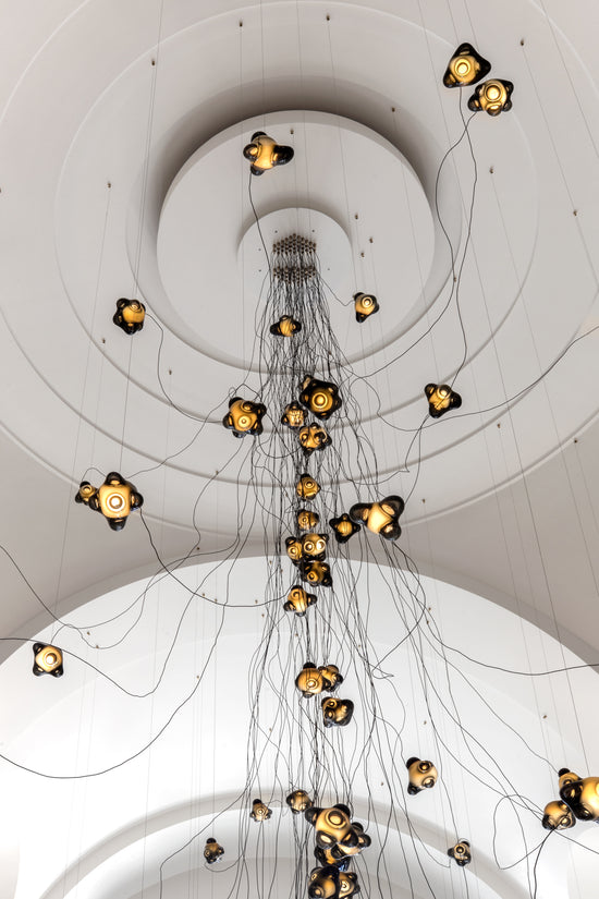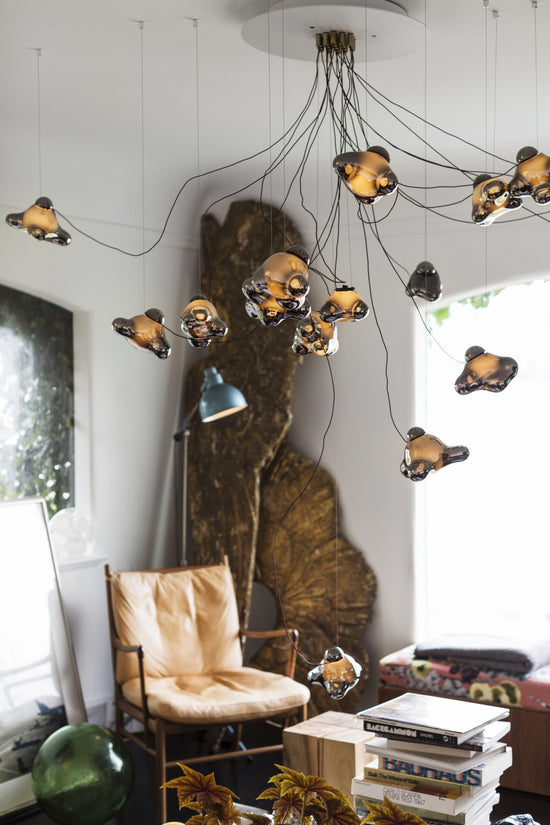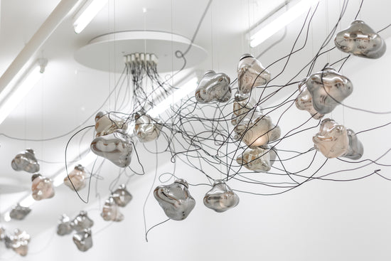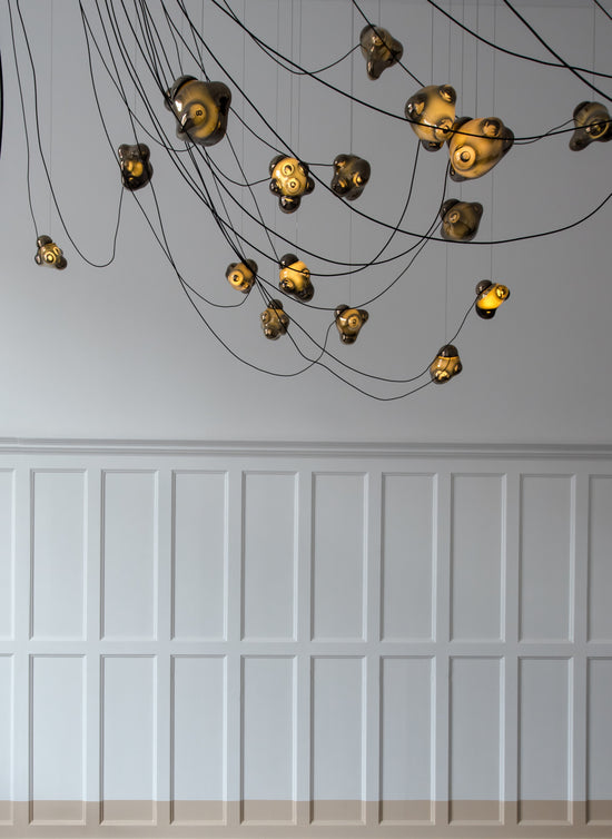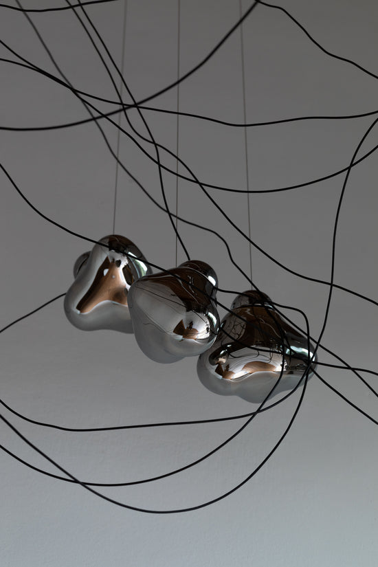 57 semi-rigid is a flexible suspension system that enables pendants to be nestled in close-knit groups or loosely composed in a wider field, allowing each piece to be perceived individually.