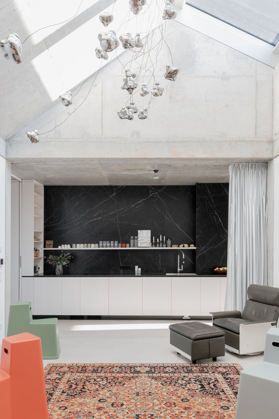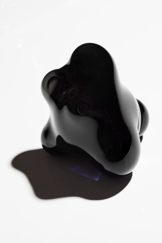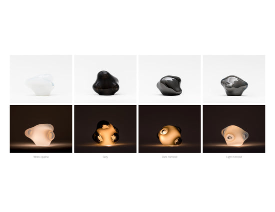 57 results from a fabrication process whereby air voids of different sizes and configurations are composed within a larger mass of dark grey or white opaline glass. These air pockets are invisible when the piece is unlit, and come alive to reveal an interior universe when 57 is illuminated. By virtue of the method of making, each 57 is completely unique.