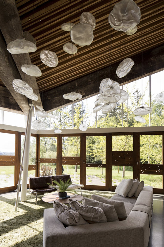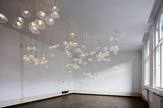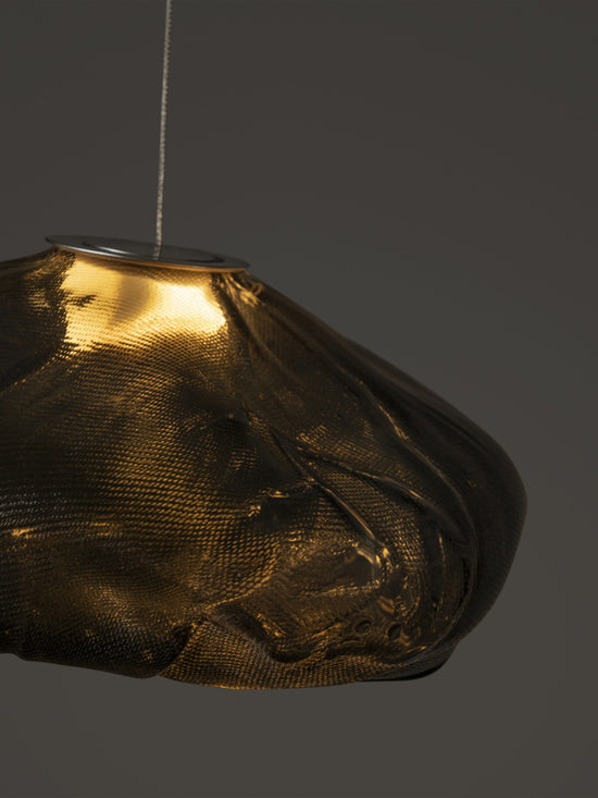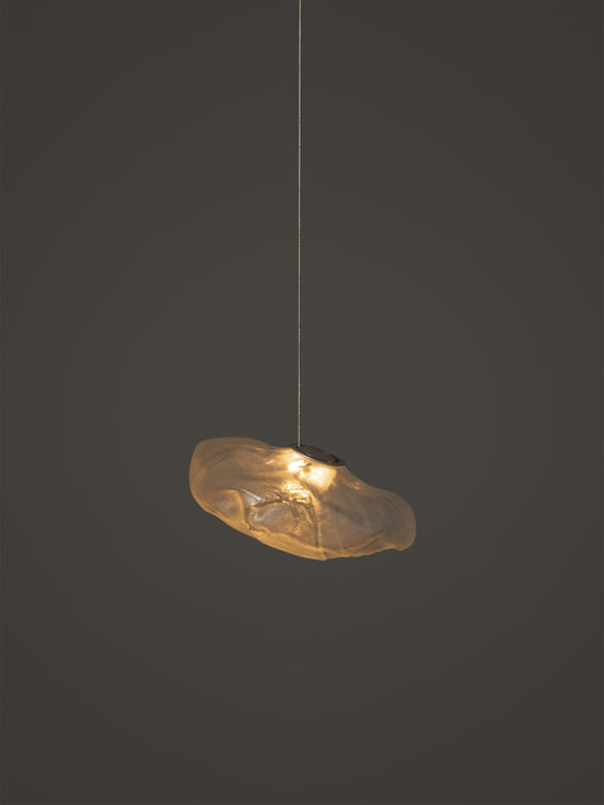 73.1m is composed of a single glass pendant, which is hand blown into a folded and highly heat-resistant ceramic fabric vessel, and attached to a mini canopy.