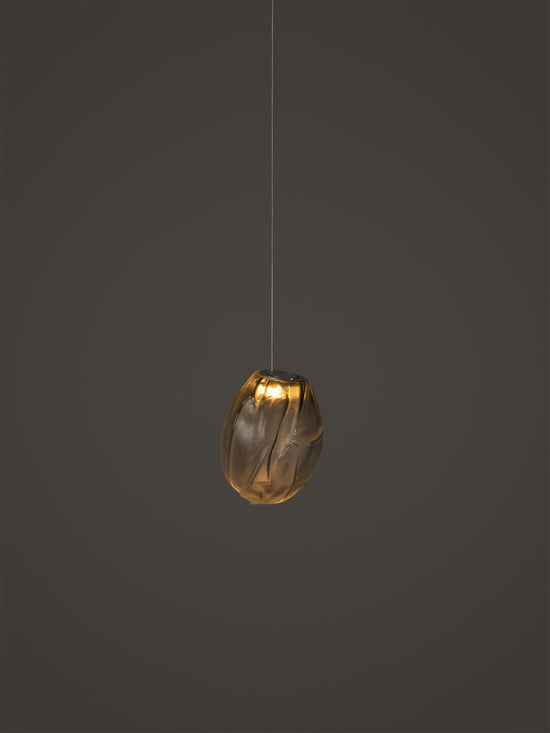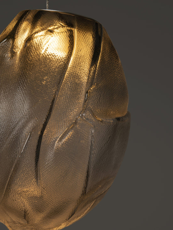 73.1V is composed of a single glass pendant, which is hand blown into a folded and highly heat-resistant ceramic fabric vessel.