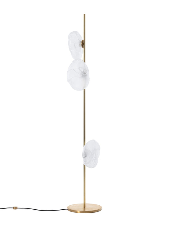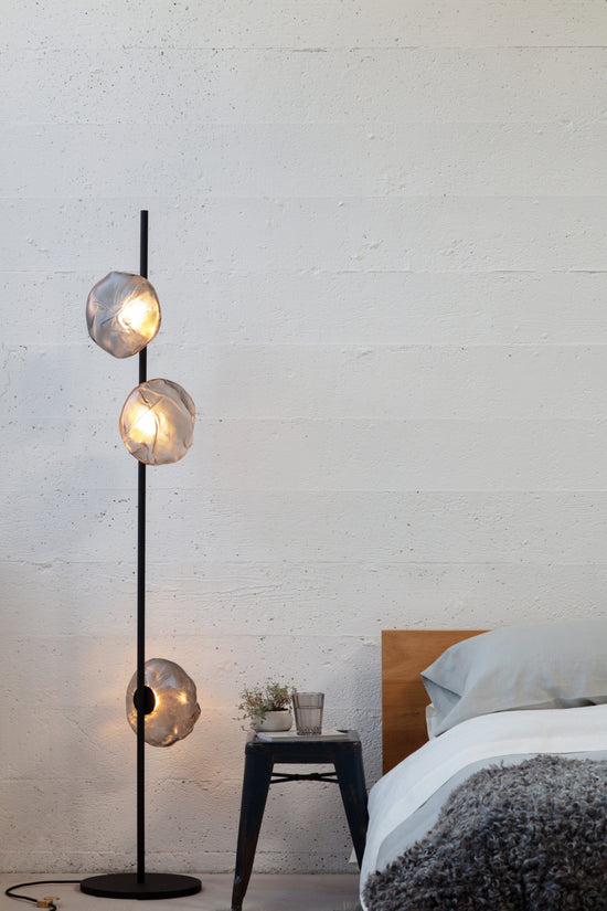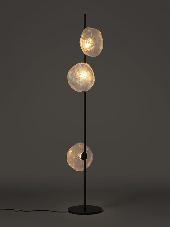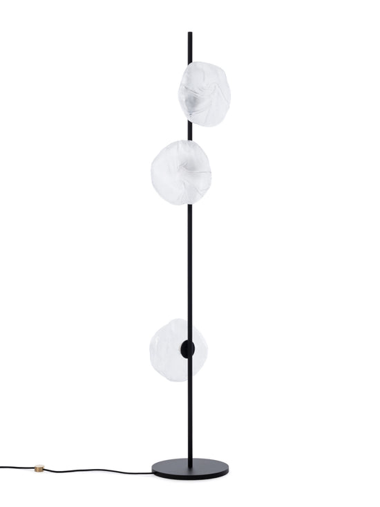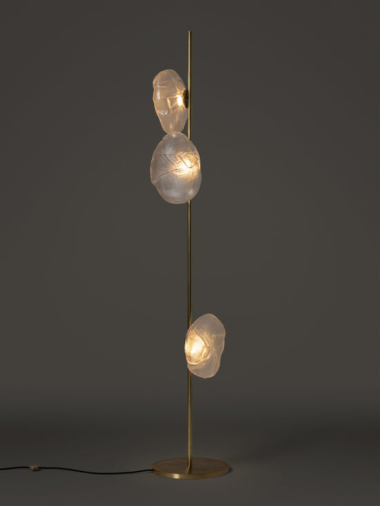 73.3 is composed of three hand-blown glass pendants mounted on a long stem (1.8m) available in a black powder-coated or brass finish with a 350mm diameter base.