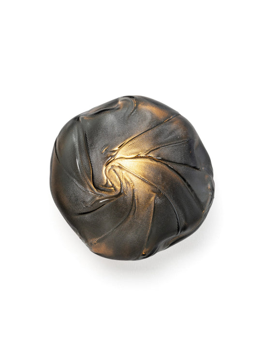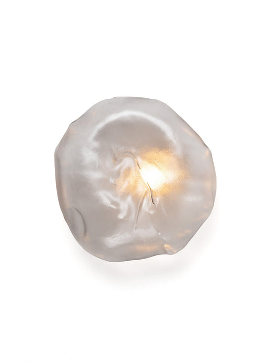 The 73 is formed by blowing liquid glass into a folded and highly heat-resistant ceramic fabric vessel. The resulting shape has a formal and textural expression intuitively associated with fabric, which becomes permanent and rigid as it cools. Each 73 is completely unique in proportion, size and shape.