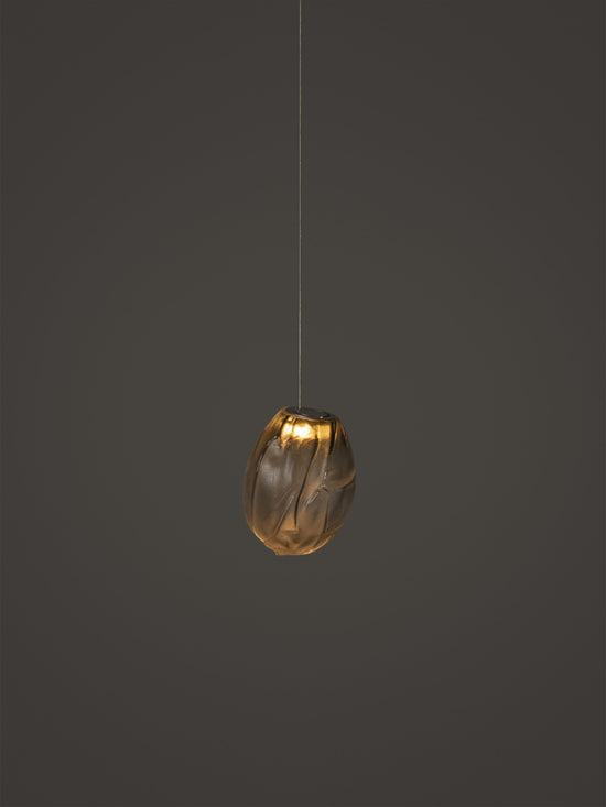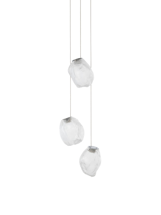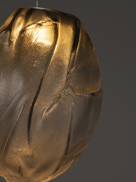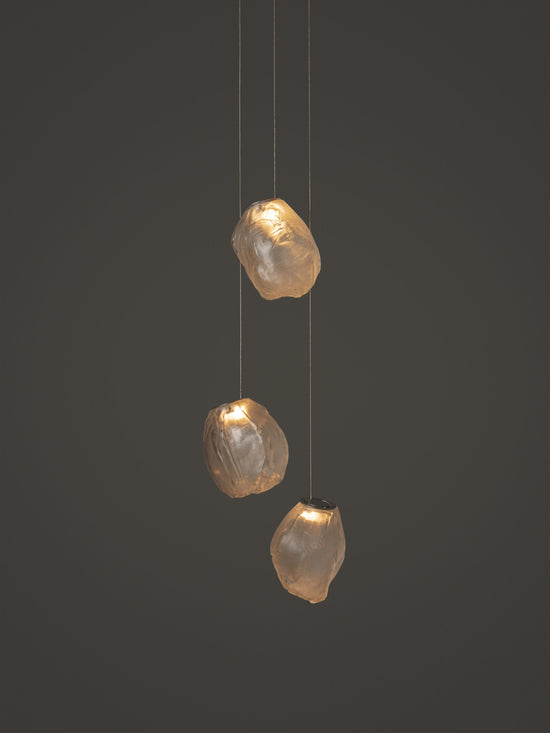 73.3V is composed of three glass pendants, which are hand blown into a folded and highly heat-resistant ceramic fabric vessel and attached to a single canopy.
