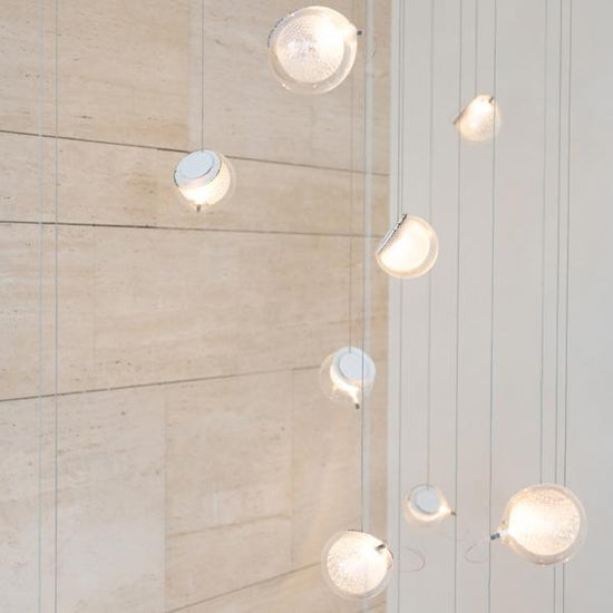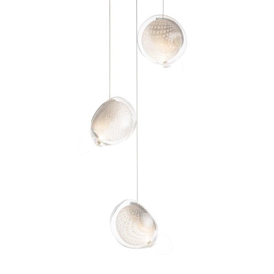 76.3 is comprised of 3 blown glass and copper pendants which attach to a single brushed nickel canopy.