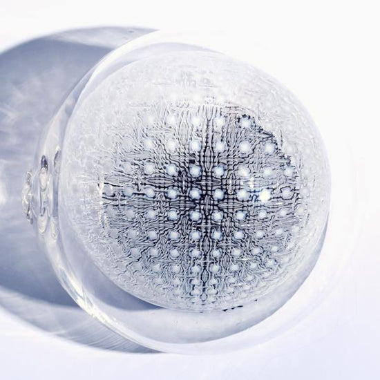 A vacuum is introduced to a strata composed of hot white and clear glass with copper mesh between; the vacuum causes the white layer to pull away through the embedded mesh, leaving numerous tendrils of white glass suspended within an interstitial space as it goes.
