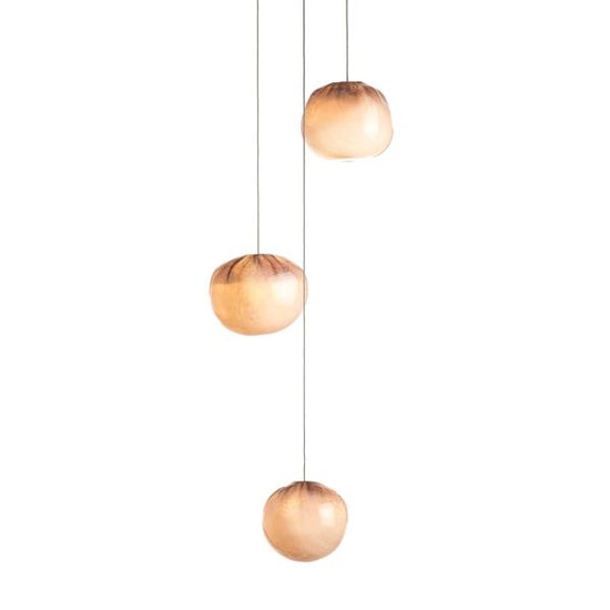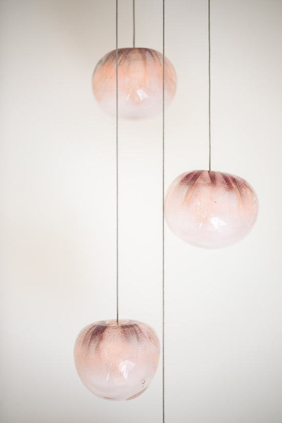 84.3 is comprised of 3 blown glass pendants which attach to a single 6″ diameter white canopy.