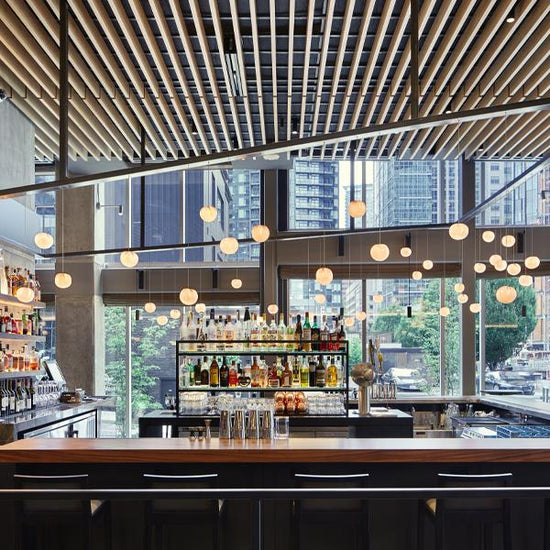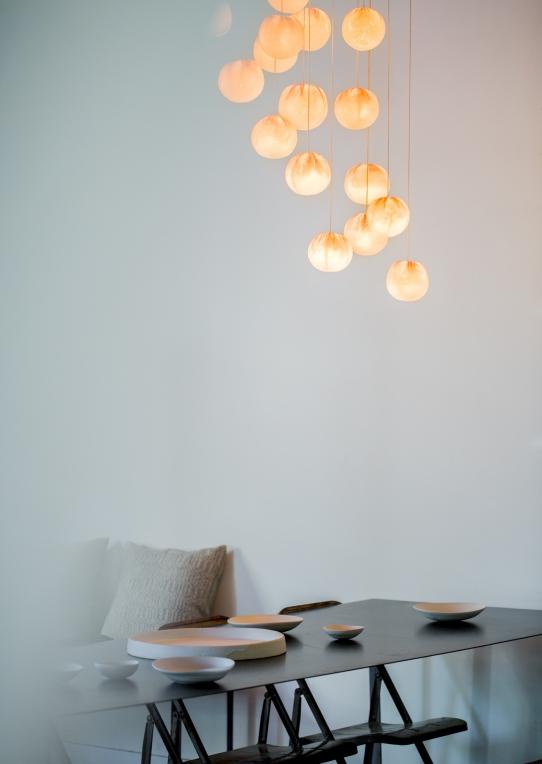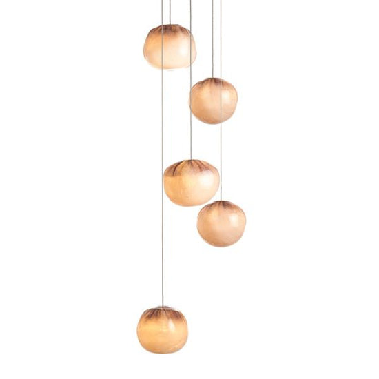 84.5 is comprised of 5 blown glass pendants which attach to a single white canopy.