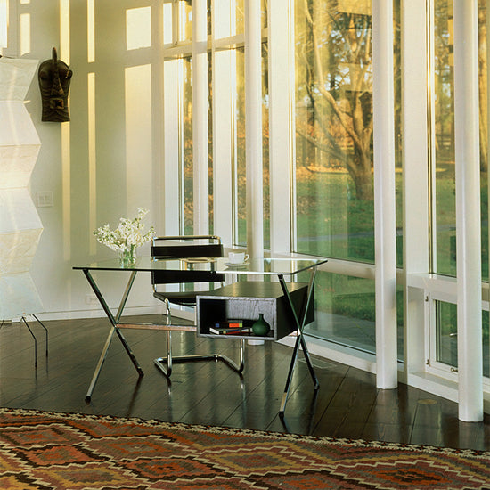 Franco Albini’s 1928 desk combines glass, steel and wood with striking clarity and balance. A clear demonstration of Albini’s rationalist design philosophy and minimalist aesthetic, the design derives its appeal through simplicity of form and celebration of material, without extraneous ornamentation.