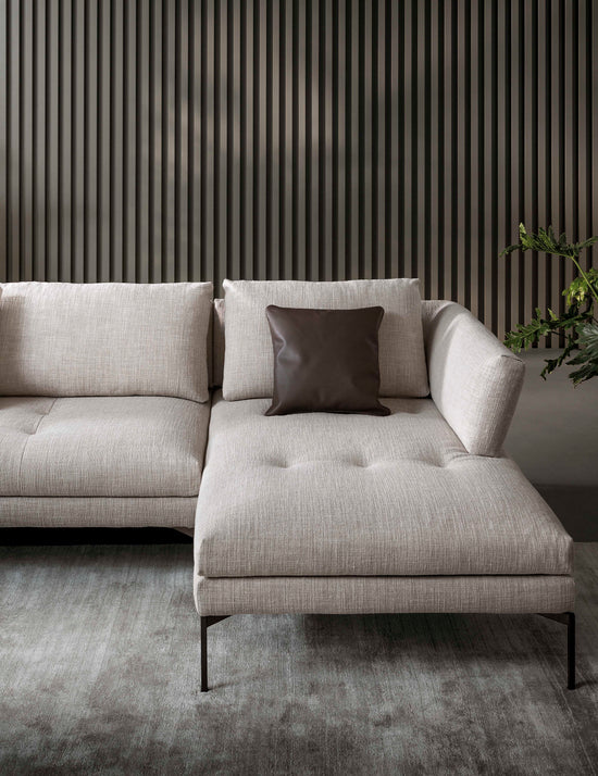 The aerial, fabric-covered frame matches the cushions and backrests in various sizes, creating a visually light, yet restrained ensemble. The lightness of the ensemble is further emphasized by the slender, minimal shape of the metal foot, available in different colours. Thanks to its versatile elements, the collection assumes different, interesting configurations for a living area with a focus on customization.
