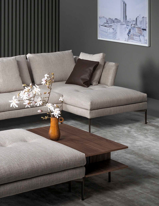 The system is completed by the Aliante side tables, available in Canaletto walnut or with a ceramic top and made in different shapes and sizes, accessories that play with the space when positioned laterally, in front of the sofa or between two elements of the composition.